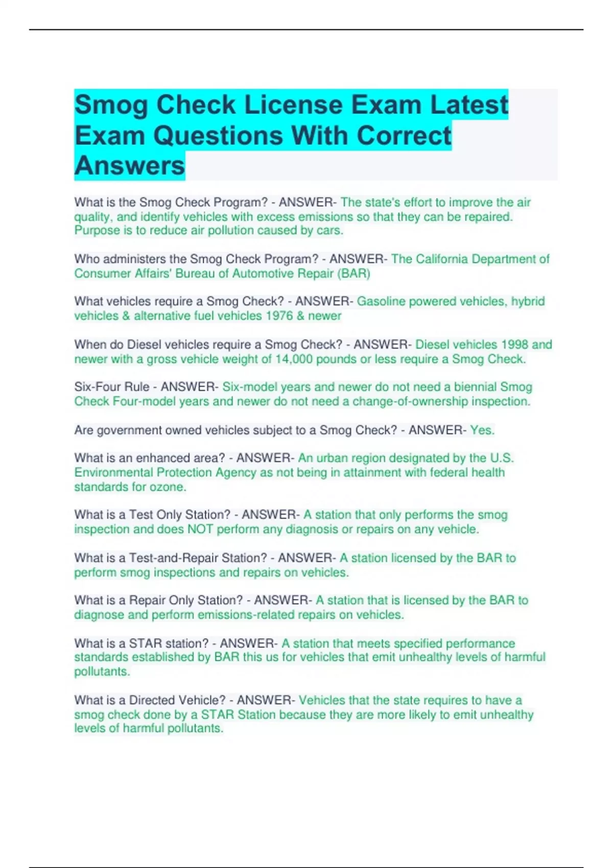 Smog Check License Exam Latest Exam Questions With Correct Answers
