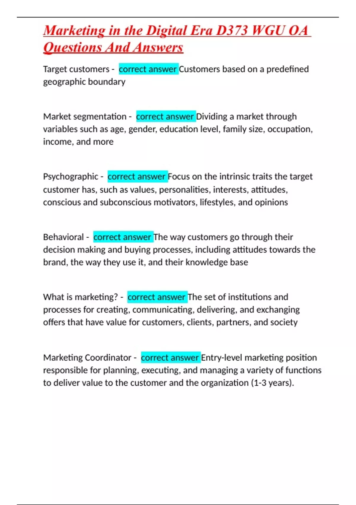 Marketing in the Digital Era D373 WGU OA Questions And Answers