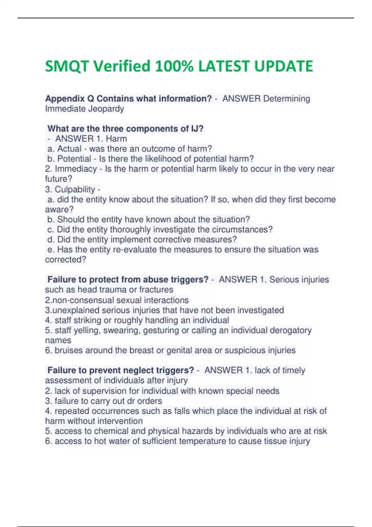 SMQT Verified 100% LATEST UPDATE Appendix Q Contains what information? - ANSWER Determining Immediate Jeopardy What are the three components of IJ? - ANSWER 1. Harm a. Actual - was there an outcome of harm? b. Potential - Is there the likelihood of potential harm? 2. Immediacy - Is the harm or potential harm likely to occur in the very near future? 3. Culpability - a. did the entity know about the situation? If so, when did they first become aware? b. Should the entity have known about the situation? c. Did the entity thoroughly investigate the circumstances? d. Did the entity implement corrective measures? e. Has the entity re-evaluate the measures to ensure the situation was corrected? Failure to protect from abuse triggers? - ANSWER 1. Serious injuries such as head trauma or fractures -consensual sexual interactions lained serious injuries that have not been investigated 4. staff striking or roughly handling an individual 5. staff yelling, swearing, gesturing or calling an individual derogatory names 6. bruises around the breast or genital area or suspicious injuries Failure to prevent neglect triggers? - ANSWER 1. lack of timely assessment of individuals after injury 2. lack of supervision for individual with known special needs 3. failure to carry out dr orders 4. repeated occurrences such as falls which place the individual at risk of harm without intervention 5. access to chemical and physical hazards by individuals who are at risk 6. access to hot water of sufficient temperature to cause tissue injury 7. non functioning call system without compensatory measures 8. unsupervised smoking by an individual with a known safety risk 9. lack of supervision of cognitively impaired individuals with known elopement risk 10. failure to adequately monitor individuals with known severe selfinjurious behavior 11. failure to adequately monitor and intervene for serious medical/surgical conditions 12. use of chemical./physical restraints without adequate monitoring 13. improper feeding/positioning of individual with known aspiration risk 14. inadequate supervision to prevent physical altercations Failure to protect from psychological harm triggers? - ANSWER 1. Application of chemical/physical restraints without clinical indication 2. Presence of behaviors by staff such as threatening or demeaning resulting in displays of fear, unwillingness to communicate and recent or sudden changes in behavior by individuals 3. Lack of interventions to prevent individuals from creating an environment of fear Failure to protect from undue adverse medication consequences and/or failure to provide medications as prescribed triggers - ANSWER 1. Administration of medication to an individual with a known history of allergic reaction to that medication 2. Lack of monitoring and identification of potential serious drug interaction, side effects, and adverse reactions 3. Administration of contraindicated medications 4. Pattern of repeated medication errors without intervention 5. Lack of diabetic monitoring resulting or likely to result in serious hypoglycemia or hyperglycemic reaction 6. Lack of timely and appropriate monitoring required for drug titration