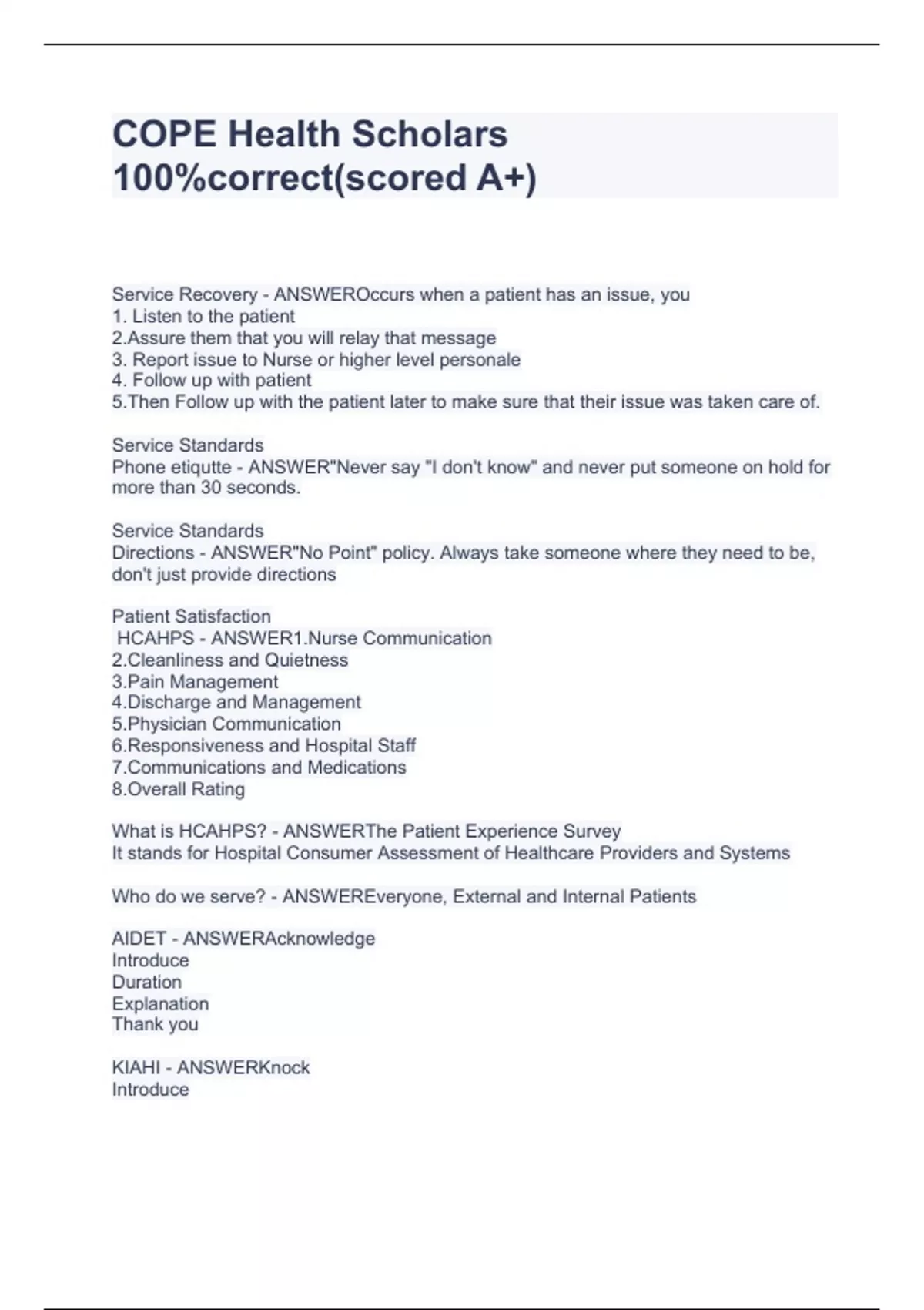Service Recovery - ANSWEROccurs when a patient has an issue, you 1. Listen to the patient 2.Assure them that you will relay that message 3. Report issue to Nurse or higher level personale 4. Follow up with patient 5.Then Follow up with the patient later to make sure that their issue was taken care of. Service Standards Phone etiqutte - ANSWER"Never say "I don't know" and never put someone on hold for more than 30 seconds. Service Standards Directions - ANSWER"No Point" policy. Always take someone where they need to be, don't just provide directions Patient Satisfaction