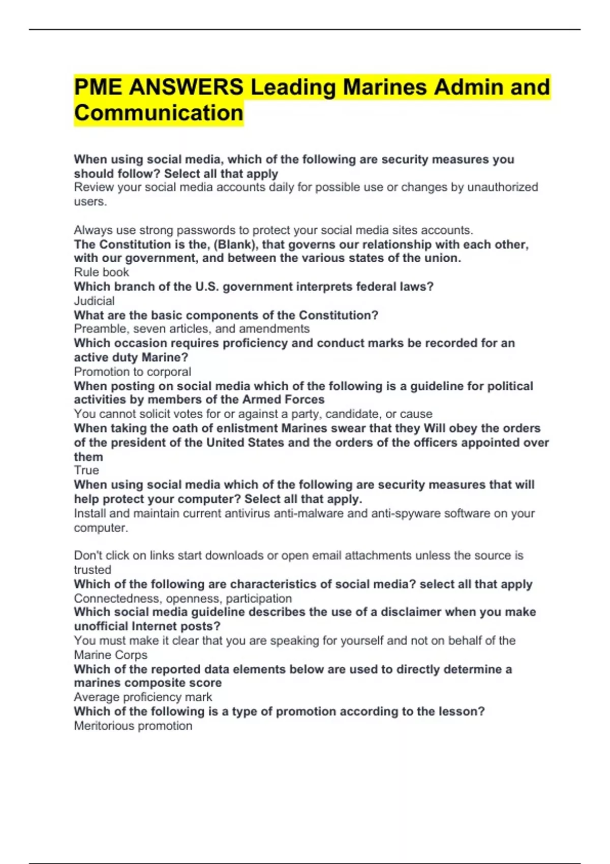 PME ANSWERS Leading Marines Admin and Communication When using social media, which of the following are security measures you should follow? Select all that apply Review your social media accounts daily for possible use or changes by unauthorized users. Always use strong passwords to protect your social media sites accounts. The Constitution is the, (Blank), that governs our relationship with each other, with our government, and between the various states of the union. Rule book Which branch of the U.S. government interprets federal laws? Judicial What are the basic components of the Constitution? Preamble, seven articles, and amendments Which occasion requires proficiency and conduct marks be recorded for an active duty Marine? Promotion to corporal When posting on social media which of the following is a guideline for political activities by members of the Armed Forces You cannot solicit votes for or against a party, candidate, or cause When taking the oath of enlistment Marines swear that they Will obey the orders of the president of the United States and the orders of the officers appointed over them True When using social media which of the following are security measures that will help protect your computer? Select all that apply. Install and maintain current antivirus anti-malware and anti-spyware software on your computer. Don't click on links start downloads or open email attachments unless the source is trusted Which of the following are characteristics of social media? select all that apply Connectedness, openness, participation Which social media guideline describes the use of a disclaimer when you make unofficial Internet posts? You must make it clear that you are speaking for yourself and not on behalf of the Marine Corps Which of the reported data elements below are used to directly determine a marines composite score Average proficiency mark Which of the following is a type of promotion according to the lesson? Meritorious promotion Which of the following are guidelines for political activities by members of the Armed Forces? Select all that apply. Don't express or imply Marine Corps endorsements of any opinion product or cause You cannot participate in any interview or discussion as an advocate for or against party candidate or cause You cannot solicit votes for or against a party candidate or cause Which of the following are social media guidelines Professionally and respectfully correct misinformation made by others about the Marine Corps Don't use any words logos or other marks that would infringe upon intellectual property rights of others Your social network friends and followers may potential constitute relations that can affect your ability to hold a security Clearence Which of the following is an objective of the Marine Corps promotion system To ensure that only the best and fully qualified marines are promoted What marking range would Marines fall into if they are evaluated as unacceptable in Conduct 0 to 1.9 What marking range would Marines fall into if they are you evaluated as average in conduct 4 to 4.4 Corporals and below will receive proficiency and conduct Marks (Blank) at a minimum Semi annually What branch of the US government includes the commander in chief Executive Which of the following are purposes of proficiency and conduct Marks? Select all that apply To record a marines performance To determine characterization of service upon discharge