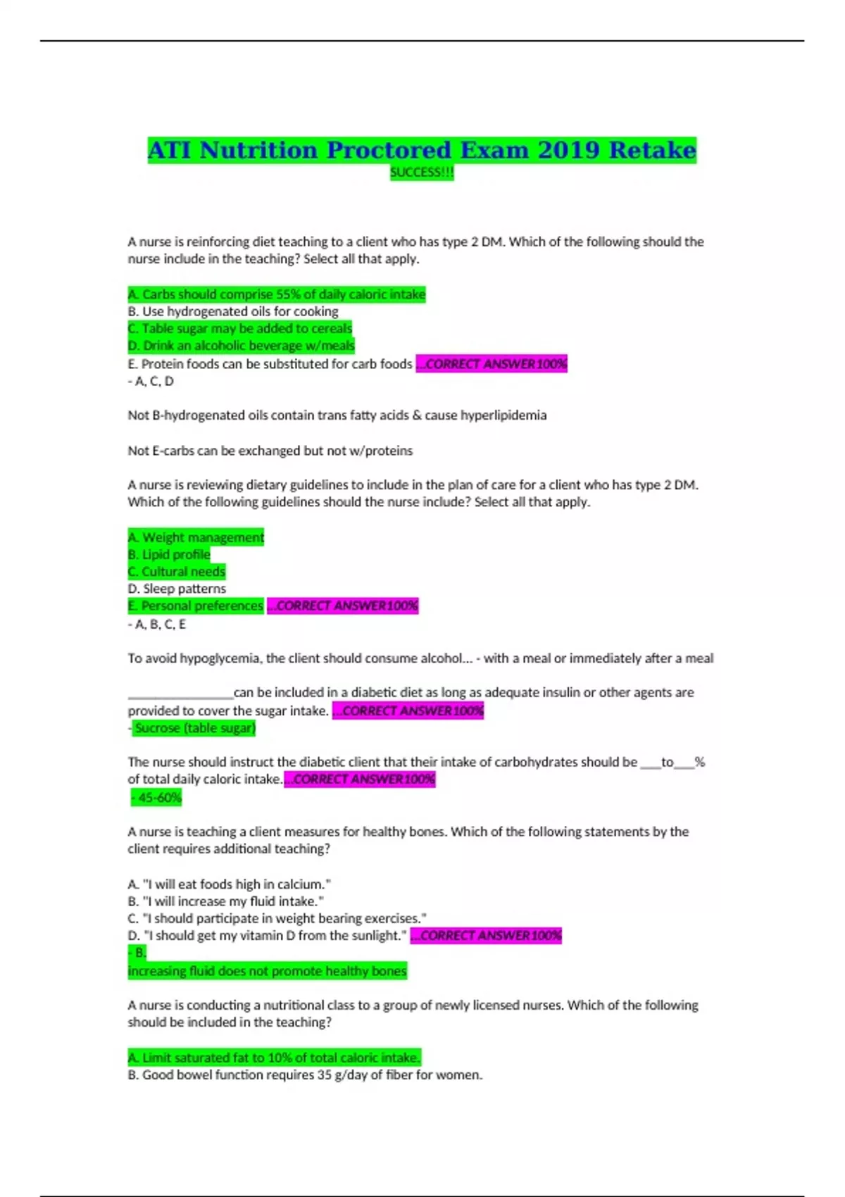 A nurse is reinforcing diet teaching to a client who has type 2 DM. Which of the following should the nurse include in the teaching? Select all that apply. A. Carbs should comprise 55% of daily caloric intake B. Use hydrogenated oils for cooking C. Table sugar may be added to cereals D. Drink an alcoholic beverage w/meals E. Protein foods can be substituted for carb foods …CORRECT ANSWER100% - A, C, D Not B-hydrogenated oils contain trans fatty acids & cause hyperlipidemia Not E-carbs can be exchanged but not w/proteins A nurse is reviewing dietary guidelines to include in the plan of care for a client who has type 2 DM. Which of the following guidelines should the nurse include? Select all that apply. A. Weight management B. Lipid profile C. Cultural needs D. Sleep patterns E. Personal preferences …CORRECT ANSWER100% - A, B, C, E To avoid hypoglycemia, the client should consume alcohol... - with a meal or immediately after a meal _______________can be included in a diabetic diet as long as adequate insulin or other agents are provided to cover the sugar intake. …CORRECT ANSWER100% - Sucrose (table sugar) The nurse should instruct the diabetic client that their intake of carbohydrates should be ___to___% of total daily caloric intake.…CORRECT ANSWER100% - 45-60% A nurse is teaching a client measures for healthy bones. Which of the following statements by the client requires additional teaching? A. "I will eat foods high in calcium."