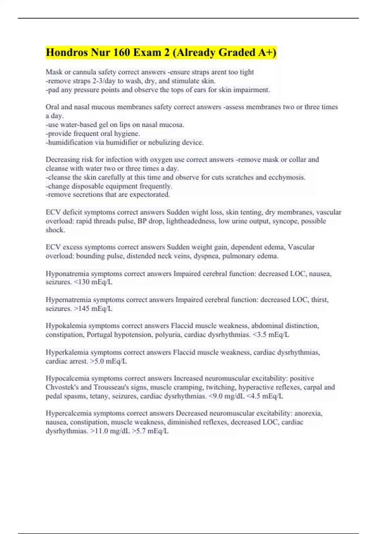 Mask or cannula safety correct answers -ensure straps arent too tight -remove straps 2-3/day to wash, dry, and stimulate skin. -pad any pressure points and observe the tops of ears for skin impairment. Oral and nasal mucous membranes safety correct answers -assess membranes two or three times a day. -use water-based gel on lips on nasal mucosa. -provide frequent oral hygiene. -humidification via humidifier or nebulizing device. Decreasing risk for infection with oxygen use correct answers -remove mask or collar and cleanse with water two or three times a day. -cleanse the skin carefully at this time and observe for cuts scratches and ecchymosis. -change disposable equipment frequently. -remove secretions that are expectorated. ECV deficit symptoms correct answers Sudden wight loss, skin tenting, dry membranes, vascular overload: rapid threads pulse, BP drop, lightheadedness, low urine output, syncope, possible shock. ECV excess symptoms correct answers Sudden weight gain, dependent edema, Vascular overload: bounding pulse, distended neck veins, dyspnea, pulmonary edema. Hyponatremia symptoms correct answers Impaired cerebral function: decreased LOC, nausea, seizures. <130 mEq/L Hypernatremia symptoms correct answers Impaired cerebral function: decreased LOC, thirst, seizures. >145 mEq/L Hypokalemia symptoms correct answers Flaccid muscle weakness, abdominal distinction, constipation, Portugal hypotension, polyuria, cardiac dysrhythmias. <3.5 mEq/L Hyperkalemia symptoms correct answers Flaccid muscle weakness, cardiac dysrhythmias, cardiac arrest. >5.0 mEq/L Hypocalcemia symptoms correct answers Increased neuromuscular excitability: positive Chvostek's and Trousseau's signs, muscle cramping, twitching, hyperactive reflexes, carpal and pedal spasms, tetany, seizures, cardiac dysrhythmias. <9.0 mg/dL <4.5 mEq/L Hypercalcemia symptoms correct answers Decreased neuromuscular excitability: anorexia, nausea, constipation, muscle weakness, diminished reflexes, decreased LOC, cardiac dysrhythmias. >11.0 mg/dL >5.7 mEq/L