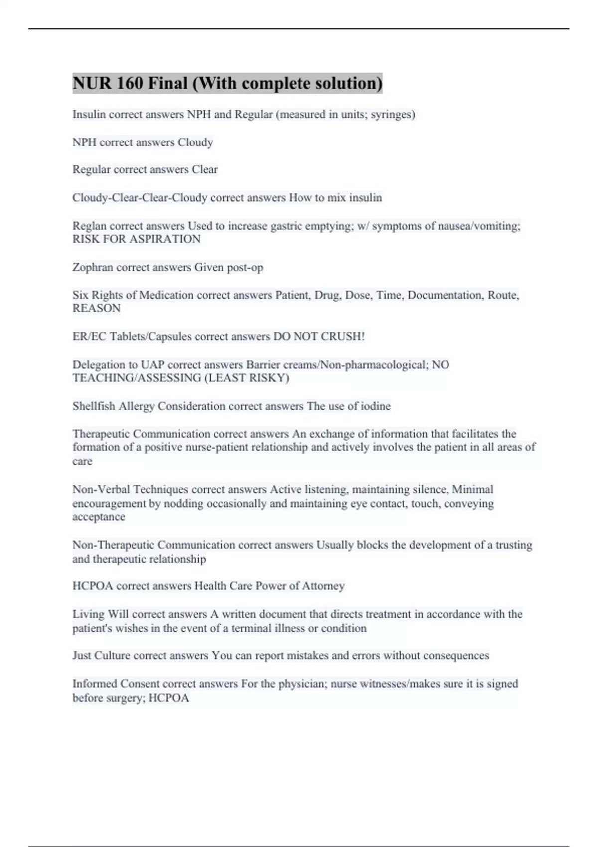 Insulin correct answers NPH and Regular (measured in units; syringes) NPH correct answers Cloudy Regular correct answers Clear Cloudy-Clear-Clear-Cloudy correct answers How to mix insulin Reglan correct answers Used to increase gastric emptying; w/ symptoms of nausea/vomiting; RISK FOR ASPIRATION Zophran correct answers Given post-op Six Rights of Medication correct answers Patient, Drug, Dose, Time, Documentation, Route, REASON ER/EC Tablets/Capsules correct answers DO NOT CRUSH! Delegation to UAP correct answers Barrier creams/Non-pharmacological; NO TEACHING/ASSESSING (LEAST RISKY) Shellfish Allergy Consideration correct answers The use of iodine Therapeutic Communication correct answers An exchange of information that facilitates the formation of a positive nurse-patient relationship and actively involves the patient in all areas of care Non-Verbal Techniques correct answers Active listening, maintaining silence, Minimal encouragement by nodding occasionally and maintaining eye contact, touch, conveying acceptance Non-Therapeutic Communication correct answers Usually blocks the development of a trusting and therapeutic relationship HCPOA correct answers Health Care Power of Attorney Living Will correct answers A written document that directs treatment in accordance with the patient's wishes in the event of a terminal illness or condition Just Culture correct answers You can report mistakes and errors without consequences Informed Consent correct answers For the physician; nurse witnesses/makes sure it is signed before surgery; HCPOA