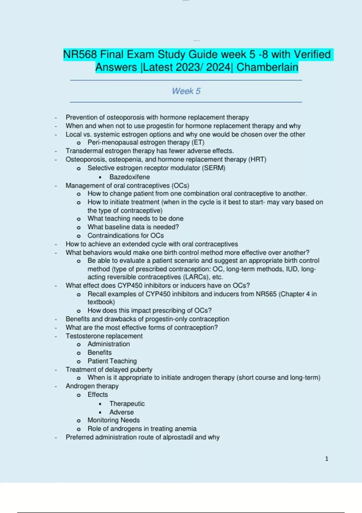 NR568 Final Exam Study Guide week 5 -8 with Verified Answers |Latest 2023/ 2024| Chamberlain
