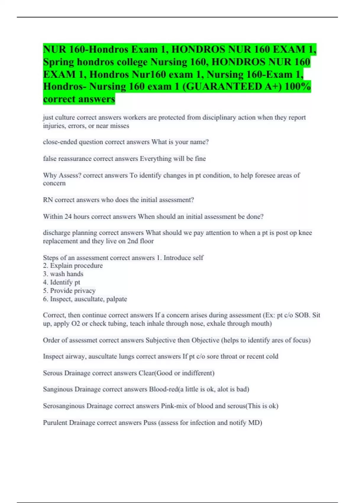NUR 160-Hondros Exam 1, HONDROS NUR 160 EXAM 1, Spring hondros college Nursing 160, HONDROS NUR 160 EXAM 1, Hondros Nur160 exam 1, Nursing 160-Exam 1, Hondros- Nursing 160 exam 1 (GUARANTEED A+) 100% correct answers