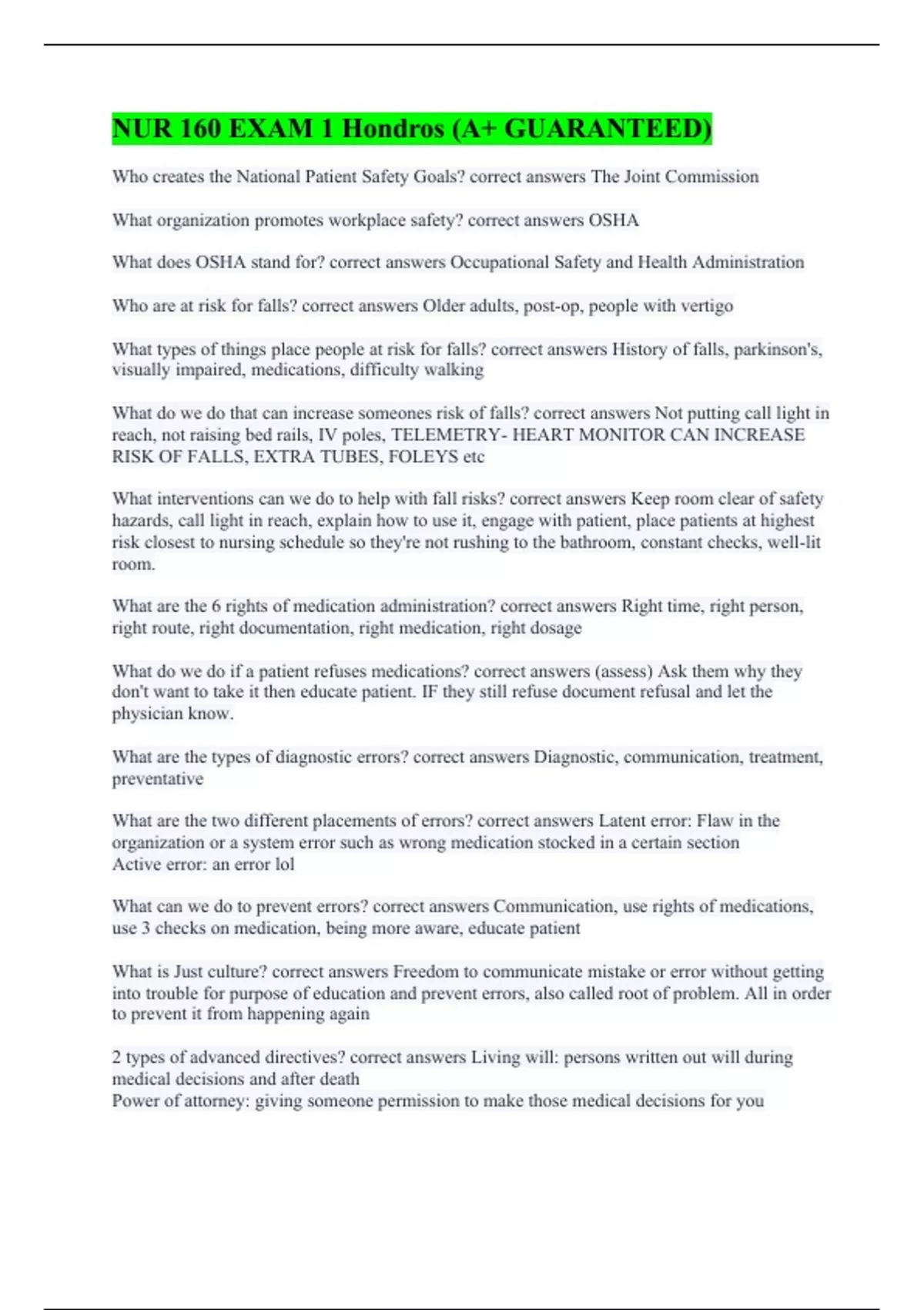 Who creates the National Patient Safety Goals? correct answers The Joint Commission What organization promotes workplace safety? correct answers OSHA What does OSHA stand for? correct answers Occupational Safety and Health Administration Who are at risk for falls? correct answers Older adults, post-op, people with vertigo What types of things place people at risk for falls? correct answers History of falls, parkinson's, visually impaired, medications, difficulty walking What do we do that can increase someones risk of falls? correct answers Not putting call light in reach, not raising bed rails, IV poles, TELEMETRY- HEART MONITOR CAN INCREASE RISK OF FALLS, EXTRA TUBES, FOLEYS etc What interventions can we do to help with fall risks? correct answers Keep room clear of safety hazards, call light in reach, explain how to use it, engage with patient, place patients at highest risk closest to nursing schedule so they're not rushing to the bathroom, constant checks, well-lit room. What are the 6 rights of medication administration? correct answers Right time, right person, right route, right documentation, right medication, right dosage What do we do if a patient refuses medications? correct answers (assess) Ask them why they don't want to take it then educate patient. IF they still refuse document refusal and let the physician know. What are the types of diagnostic errors? correct answers Diagnostic, communication, treatment, preventative What are the two different placements of errors? correct answers Latent error: Flaw in the organization or a system error such as wrong medication stocked in a certain section Active error: an error lol What can we do to prevent errors? correct answers Communication, use rights of medications, use 3 checks on medication, being more aware, educate patient What is Just culture? correct answers Freedom to communicate mistake or error without getting into trouble for purpose of education and prevent errors, also called root of problem. All in order to prevent it from happening again 2 types of advanced directives? correct answers Living will: persons written out will during medical decisions and after death Power of attorney: giving someone permission to make those medical decisions for you