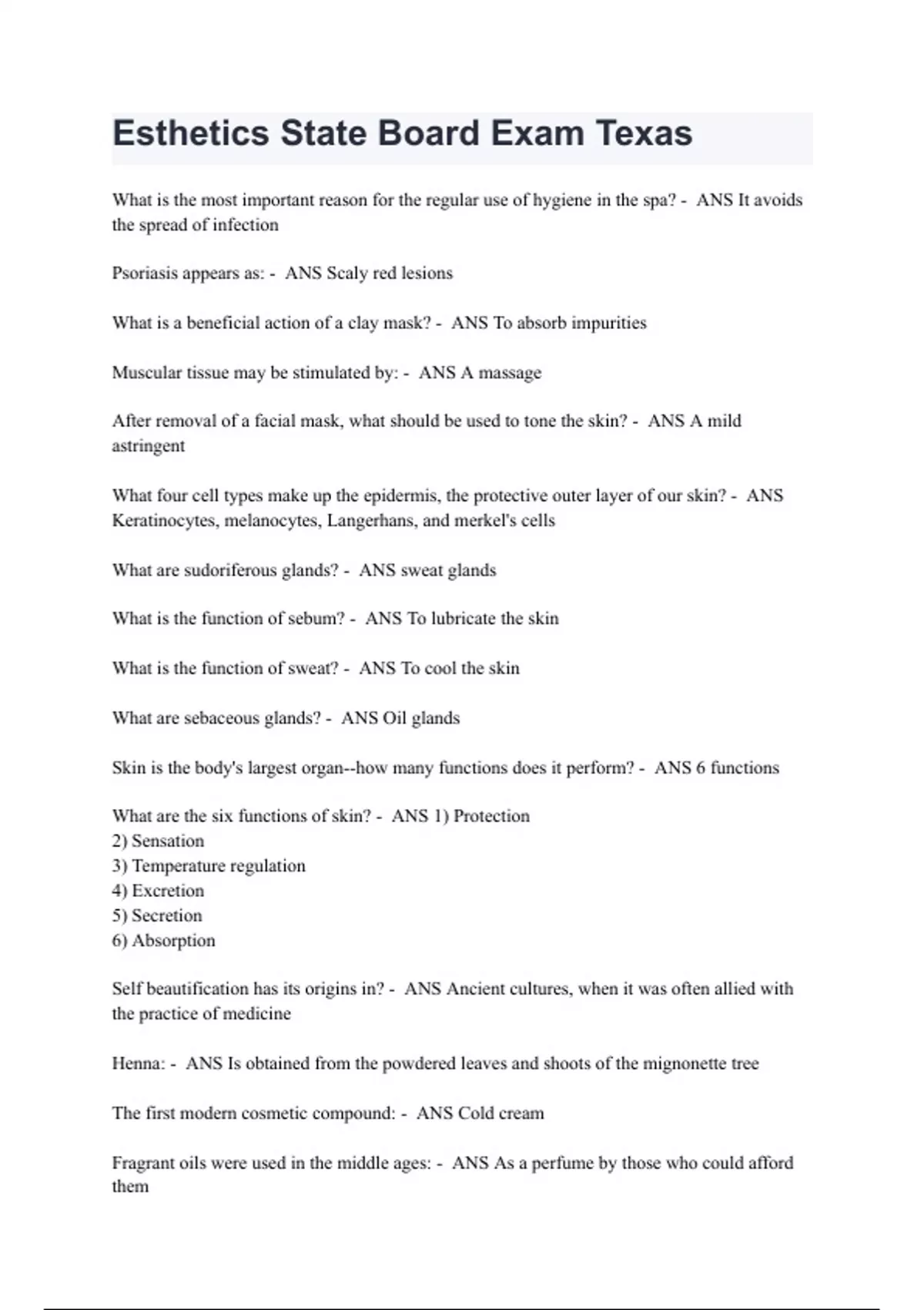 Esthetics State Board Exam Texas Questions with correct Answers 2024 (A+ Graded 100% Verified)