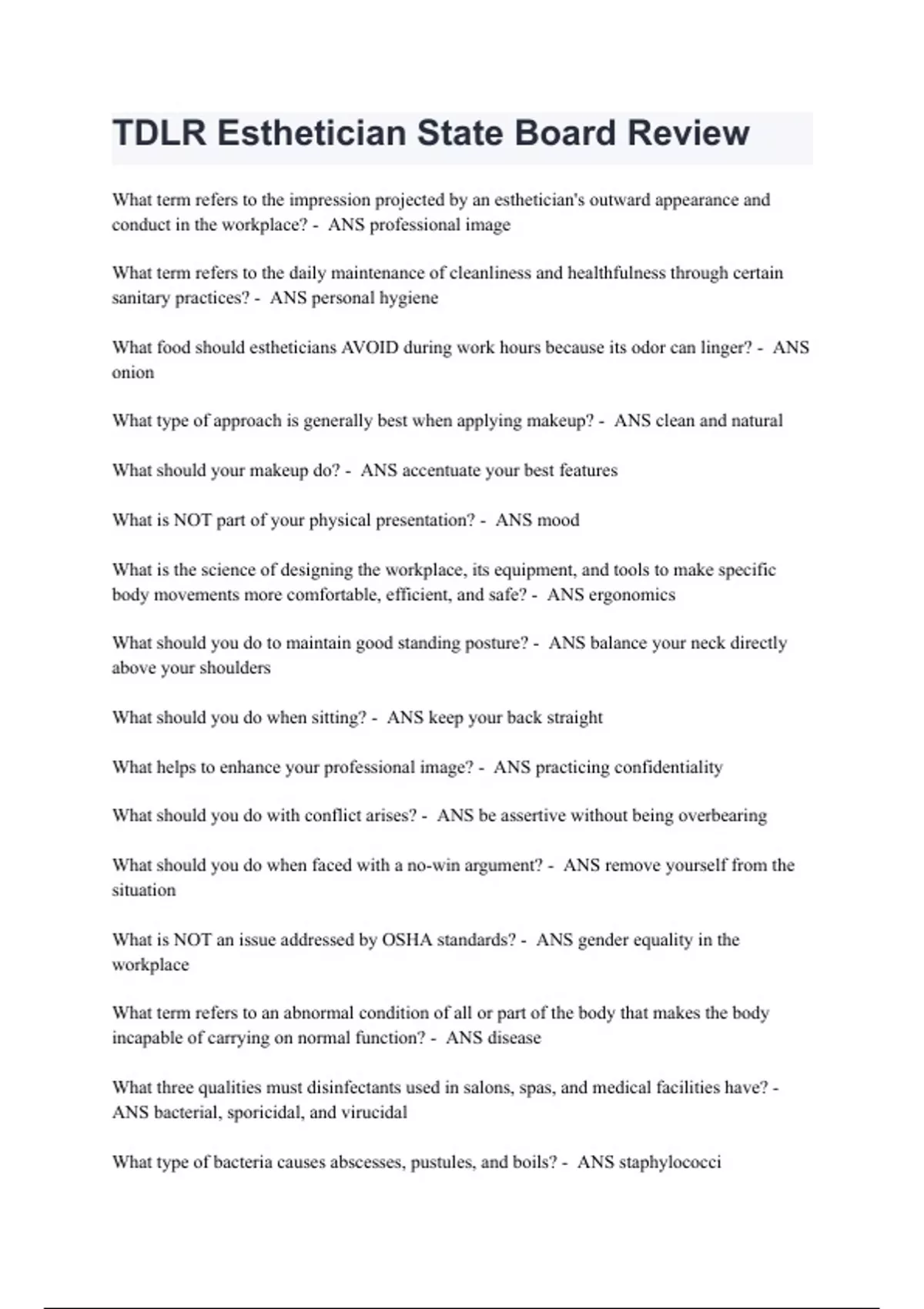 TDLR Esthetician State Board Review Questions with correct Answers 2024 (A+ Graded 100% Verified)