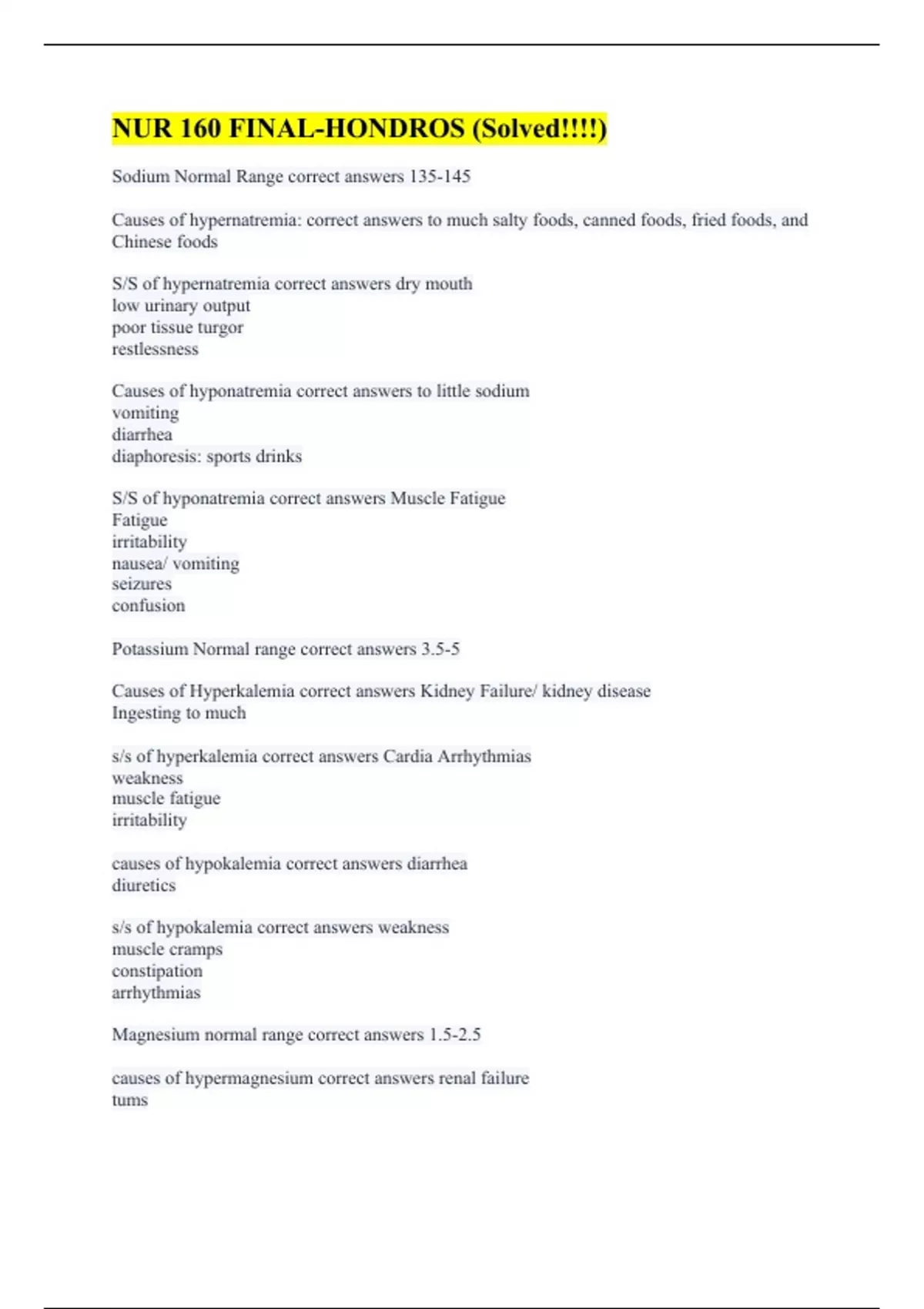 Sodium Normal Range correct answers 135-145 Causes of hypernatremia: correct answers to much salty foods, canned foods, fried foods, and Chinese foods S/S of hypernatremia correct answers dry mouth low urinary output poor tissue turgor restlessness Causes of hyponatremia correct answers to little sodium vomiting diarrhea diaphoresis: sports drinks S/S of hyponatremia correct answers Muscle Fatigue Fatigue irritability nausea/ vomiting seizures confusion Potassium Normal range correct answers 3.5-5 Causes of Hyperkalemia correct answers Kidney Failure/ kidney disease Ingesting to much s/s of hyperkalemia correct answers Cardia Arrhythmias weakness muscle fatigue irritability causes of hypokalemia correct answers diarrhea diuretics s/s of hypokalemia correct answers weakness muscle cramps constipation arrhythmias Magnesium normal range correct answers 1.5-2.5 causes of hypermagnesium correct answers renal failure tums
