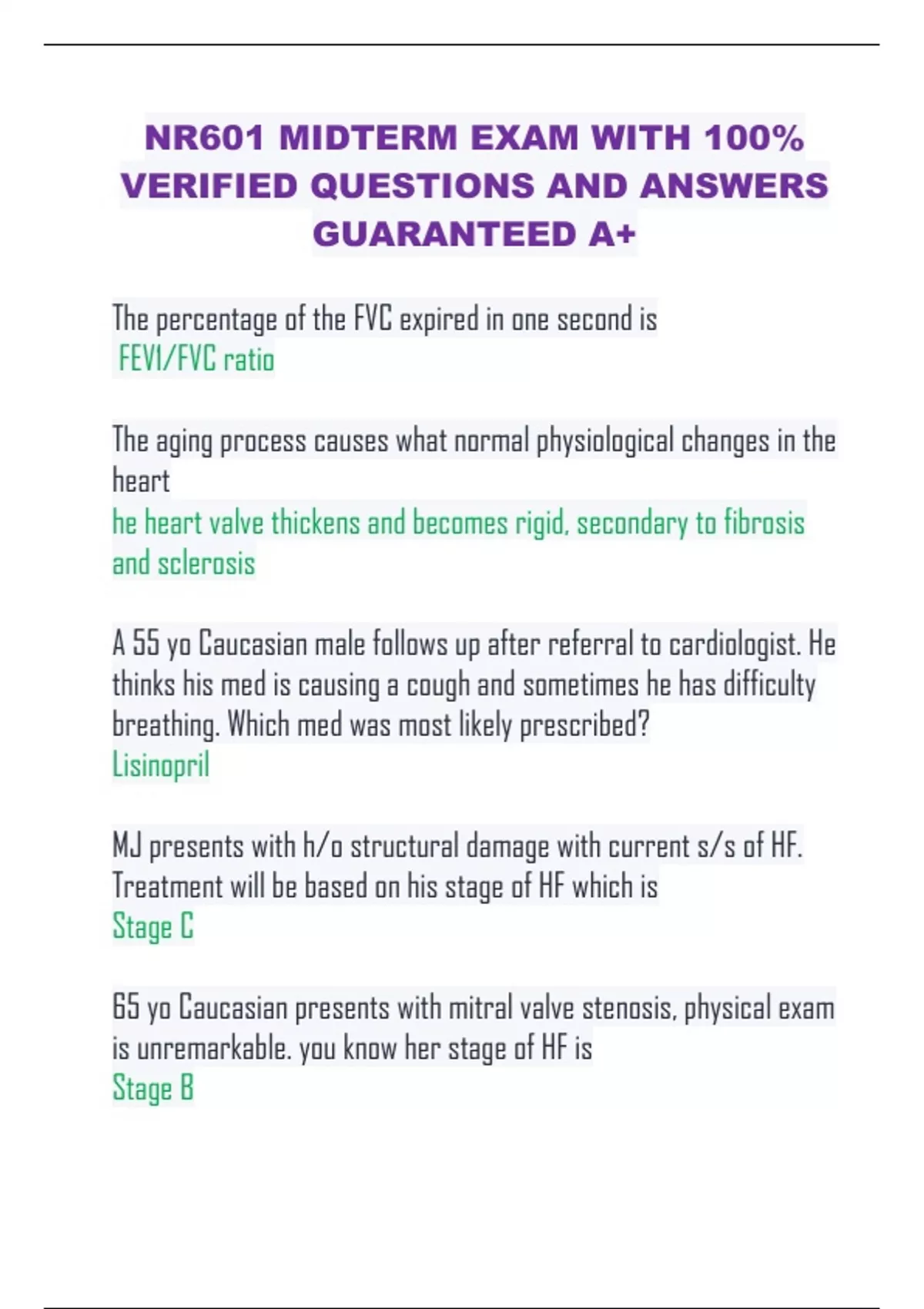 NR601 MIDTERM EXAM WITH 100% VERIFIED QUESTIONS AND ANSWERS GUARANTEED A+ The percentage of the FVC expired in one second is FEV1/FVC ratio The aging process causes what normal physiological changes in the heart he heart valve thickens and becomes rigid, secondary to fibrosis and sclerosis A 55 yo Caucasian male follows up after referral to cardiologist. He thinks his med is causing a cough and sometimes he has difficulty breathing. Which med was most likely prescribed? Lisinopril MJ presents with h/o structural damage with current s/s of HF. Treatment will be based on his stage of HF which is Stage C 65 yo Caucasian presents with mitral valve stenosis, physical exam is unremarkable. you know her stage of HF is Stage B The best way to diagnose structural heart disease/dysfunction noninvasively is Echocardiogram Chronic pain can have major impact on patients ability to function and have profound impact on overall QOL. Ongoing pain may be linked to Depression, sleep disturbance, decreased socialization The Beers criteria are appropriate for use in evaluating use of certain meds in patients 65 y/o All of the following statements are true about lab values in older adults except Abnormal findings are often due to physiological aging According to the 2017 ACC HTN guidelines, the recommended BP goal for a 65y/o African American woman with a h/o HTN and DM and no h/o CKD is 140/80 THe pathophysiology of HF is due to Inadequate cardiac output to meet the metabolic and O2 demands of the body The volume of air a patient to exhale for total duration of the test during maximal effort is FVC According it the 2017 ACC HTN guidelines, normal BP is 120/80 Functional abilities are best assessed by Observed assessment of function LB is a 77 yo with chronic poorly controlled HTN. You know that goals include prevention of target organ damage. During your eval you will assess for evidence of Left ventricular hypertrophy Aortic regurgitation requires medical treatment for early signs of HF with ACEi The volume of air in the lungs at max inflation is TLC (total lung capacity)