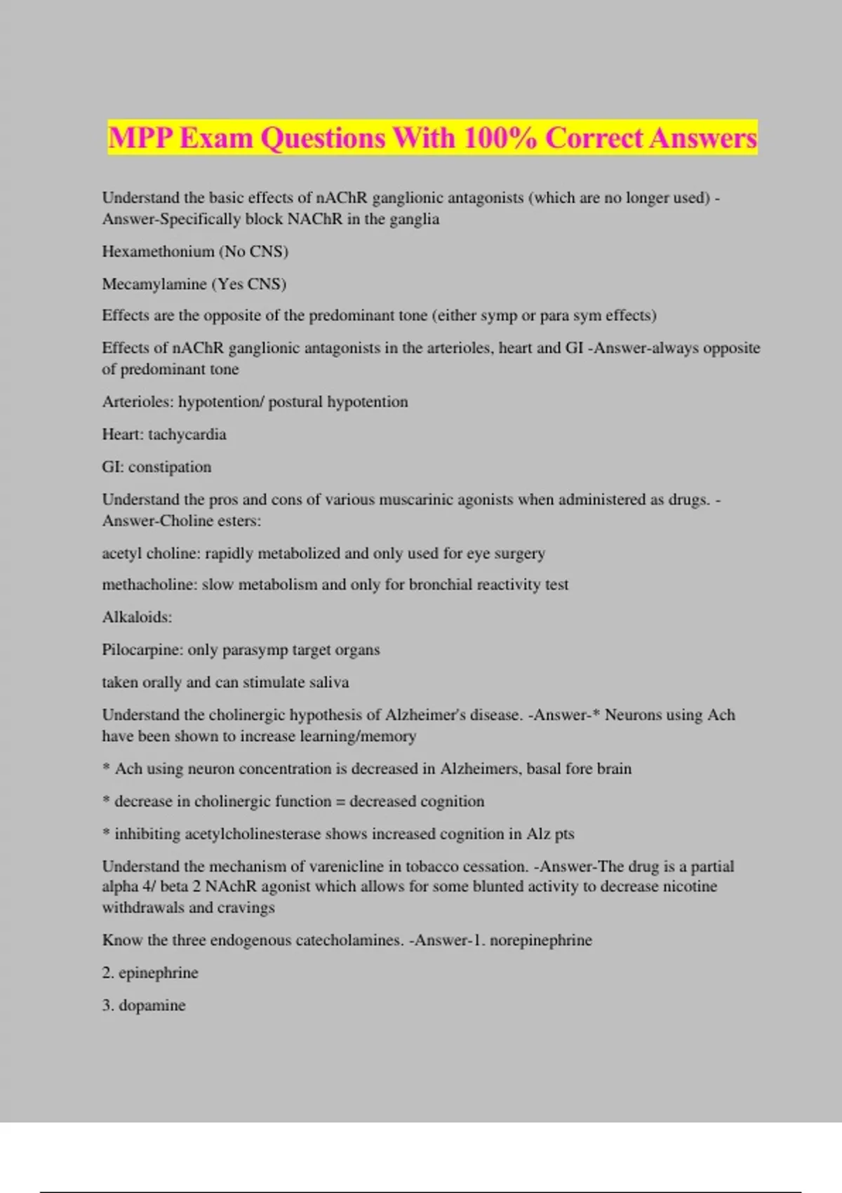 MPP Exam Questions With 100% Correct Answers Understand the basic effects of nAChR ganglionic antagonists (which are no longer used) - Answer-Specifically block NAChR in the ganglia Hexamethonium (No CNS) Mecamylamine (Yes CNS) Effects are the opposite of the predominant tone (either symp or para sym effects) Effects of nAChR ganglionic antagonists in the arterioles, heart and GI -Answer-always opposite of predominant tone Arterioles: hypotention/ postural hypotention Heart: tachycardia GI: constipation Understand the pros and cons of various muscarinic agonists when administered as drugs. - Answer-Choline esters: acetyl choline: rapidly metabolized and only used for eye surgery methacholine: slow metabolism and only for bronchial reactivity test Alkaloids: Pilocarpine: only parasymp target organs taken orally and can stimulate saliva Understand the cholinergic hypothesis of Alzheimer's disease. -Answer-* Neurons using Ach have been shown to increase learning/memory * Ach using neuron concentration is decreased in Alzheimers, basal fore brain * decrease in cholinergic function = decreased cognition * inhibiting acetylcholinesterase shows increased cognition in Alz pts Understand the mechanism of varenicline in tobacco cessation. -Answer-The drug is a partial alpha 4/ beta 2 NAchR agonist which allows for some blunted activity to decrease nicotine withdrawals and cravings Know the three endogenous catecholamines. -Answer-1. norepinephrine 2. epinephrine 3. dopamine Be familiar with alpha-adrenergic receptor agonists and antagonists (alpha 1 and 2 selective non selective) and binding affinities -Answer-Agonists: Alpha 1 selective: Phenylephrine Know the cardiovascular effects of alpha-adrenergic receptor antagonists. -Answer-decreases TPR and BP when standing, no effect when supine can reflexively increase heart and blood volume Understand opioid tolerance. -Answer-Opioid receptors are GPCRs When activated they will be desensitized by beta arrestin 2 internalization and will be resensitized by recycling soon after However within a day of use wont be recyled (short term tolerance) After a week, long term tolerance Understand the anti-inflammatory effects of NSAIDs. -Answer-Due to COX2 inhibition membrane phospholipids > (PLA2) > AA > (COX1 and 2) > PGH2 > tissue specific isomerases Reduces the vasodialaltion, pain and edema associated with inflammation and needs 2x the dose to deal with inflammation (comapred to antipyretic and analgesic) Understand the concept of asymmetric cross-tolerance between barbiturates and benzodiazepines. -Answer-Barbituates cause increased liver metabolism of benzos too and can decrease the half life But not the other way around, benzos don't decrease the half life of barb. Understand the steps involved in ethanol metabolism. -Answer-Is rapidly absorbed from gut (peak in 40 min) on empty stomach Easy tissue distribution and 0 order metabolism (7-10 grams metabolized an hour) in liver Alcohol dehydrogenase enzyme allows factor to take H+ away from alch. to make acetaldehyde which is very toxic plus acid byproduct (H+ bad for liver) then acetaldehyde dehydrogenase enzyme breaks it down to acetate (plus more acid) Also broken down by barbituate enzymes so that there is also metabolic cross tolerance with barbituates Know examples of selective serotonin reuptake inhibitors (generic names). -Answer-Fluoxetine (Prozac) Paroxetine (Paxil) Sertraline (Zoloft)