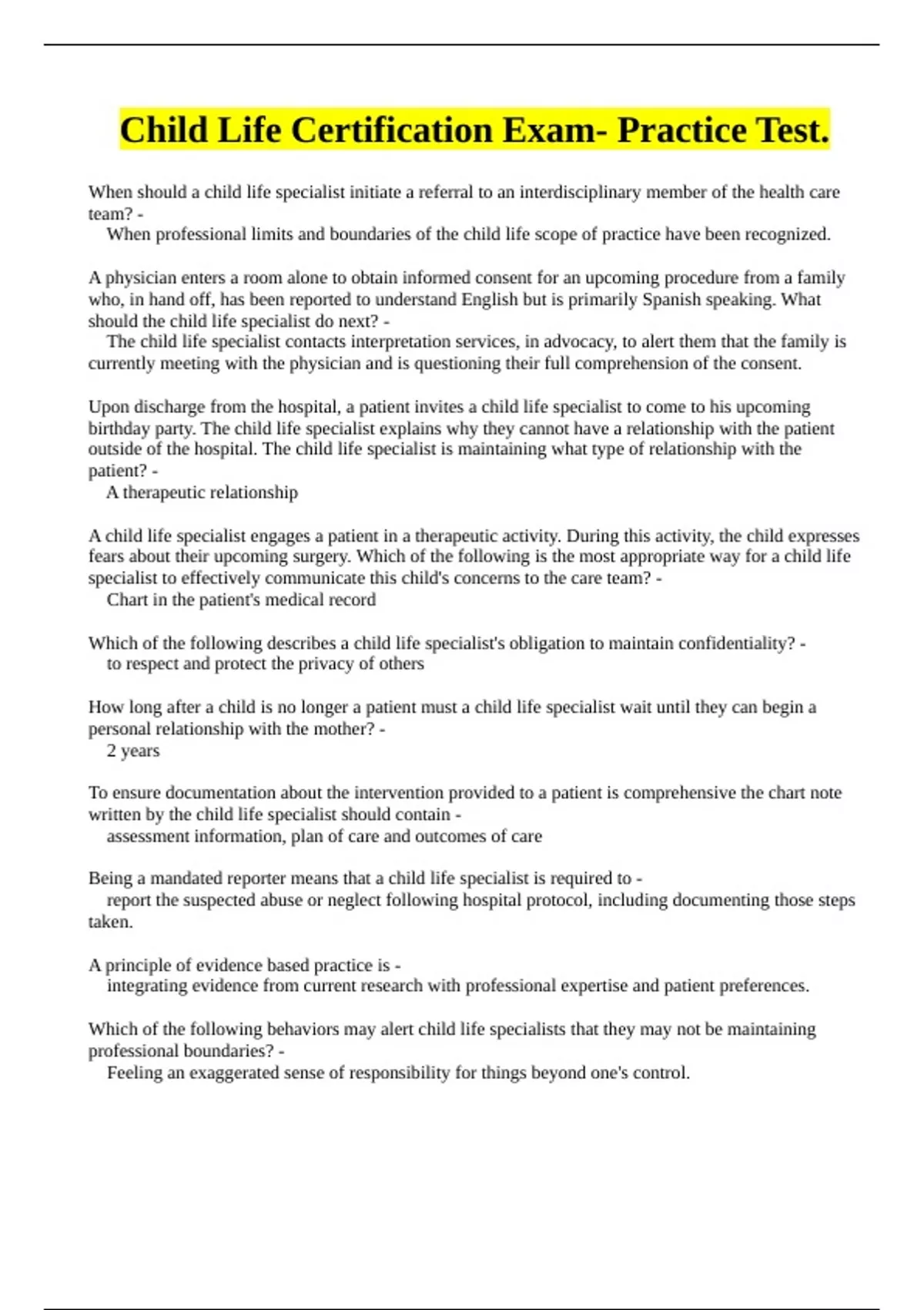 Child Life Certification Exam- Practice Test