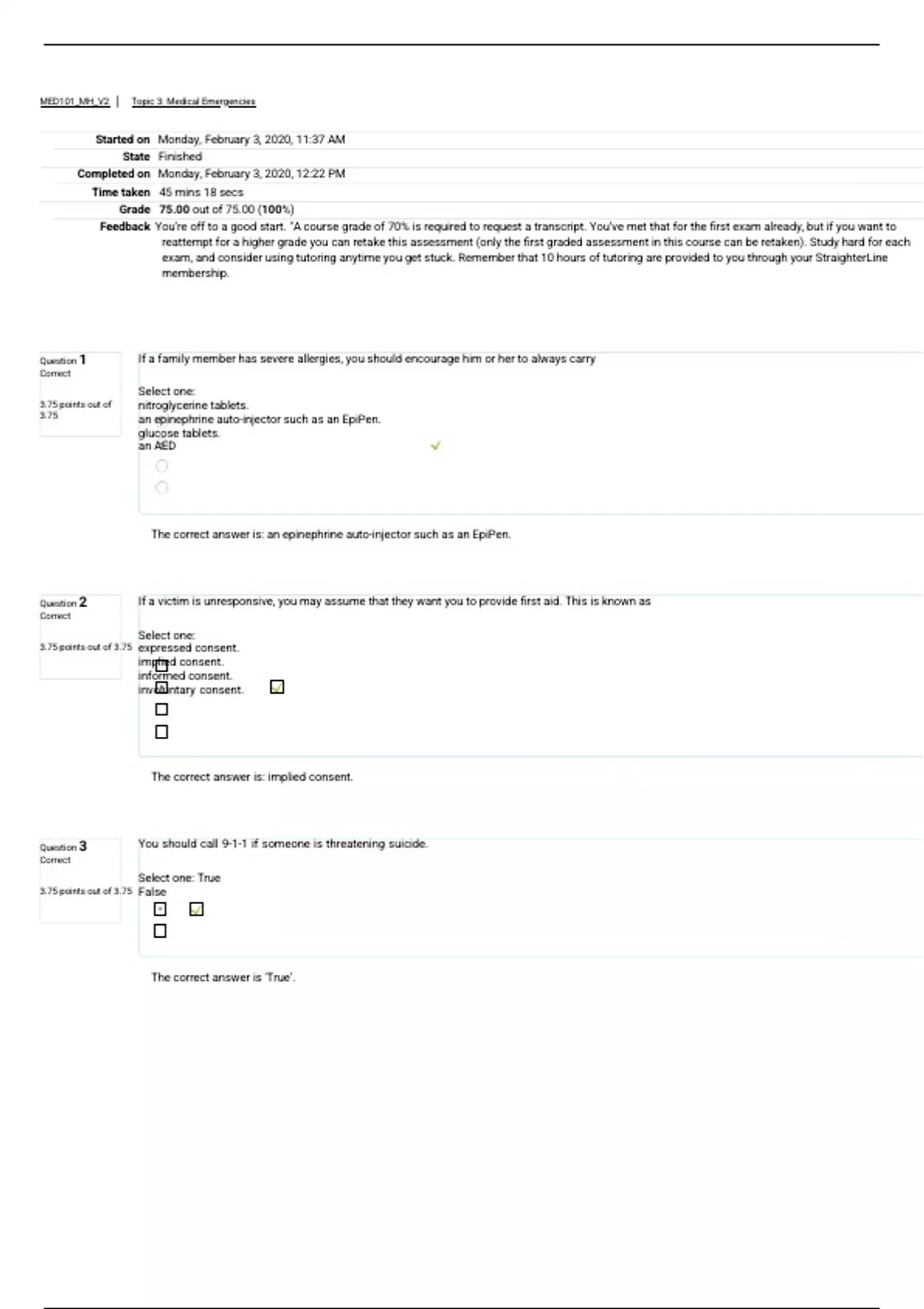 MED101_MH_V2 | Topic 3: Medical Emergencies Started on Monday, February 3, 2020, 11:37 AM State Finished Completed on Monday, February 3, 2020, 12:22 PM Time taken 45 mins 18 secs Grade 75.00 out of 75.00 (100%) Feedback You’re off to a good start. "A course grade of 70% is required to request a transcript. You’ve met that for the first exam already, but if you want to reattempt for a higher grade you can retake this assessment (only the first graded assessment in this course can be retaken). Study hard for each exam, and consider using tutoring anytime you get stuck. Remember that 10 hours of tutoring are provided to you through your StraighterLine membership. The correct answer is: an epinephrine auto-injector such as an EpiPen. The correct answer is: implied consent. The correct answer is 'True'. The correct answer is: semen. The correct answer is: Seek professional help. The correct answer is 'True'. The correct answer is: control all body functions and movement and allow for sensory perception and consciousness. The correct answer is: Abdominal cavity The correct answer is: Stroke The correct answer is: tapping the victim's shoulder and shouting, "Are you okay?" The correct answer is: Roll the person toward you on his side and bend both of the person’s knees to stabilize the body