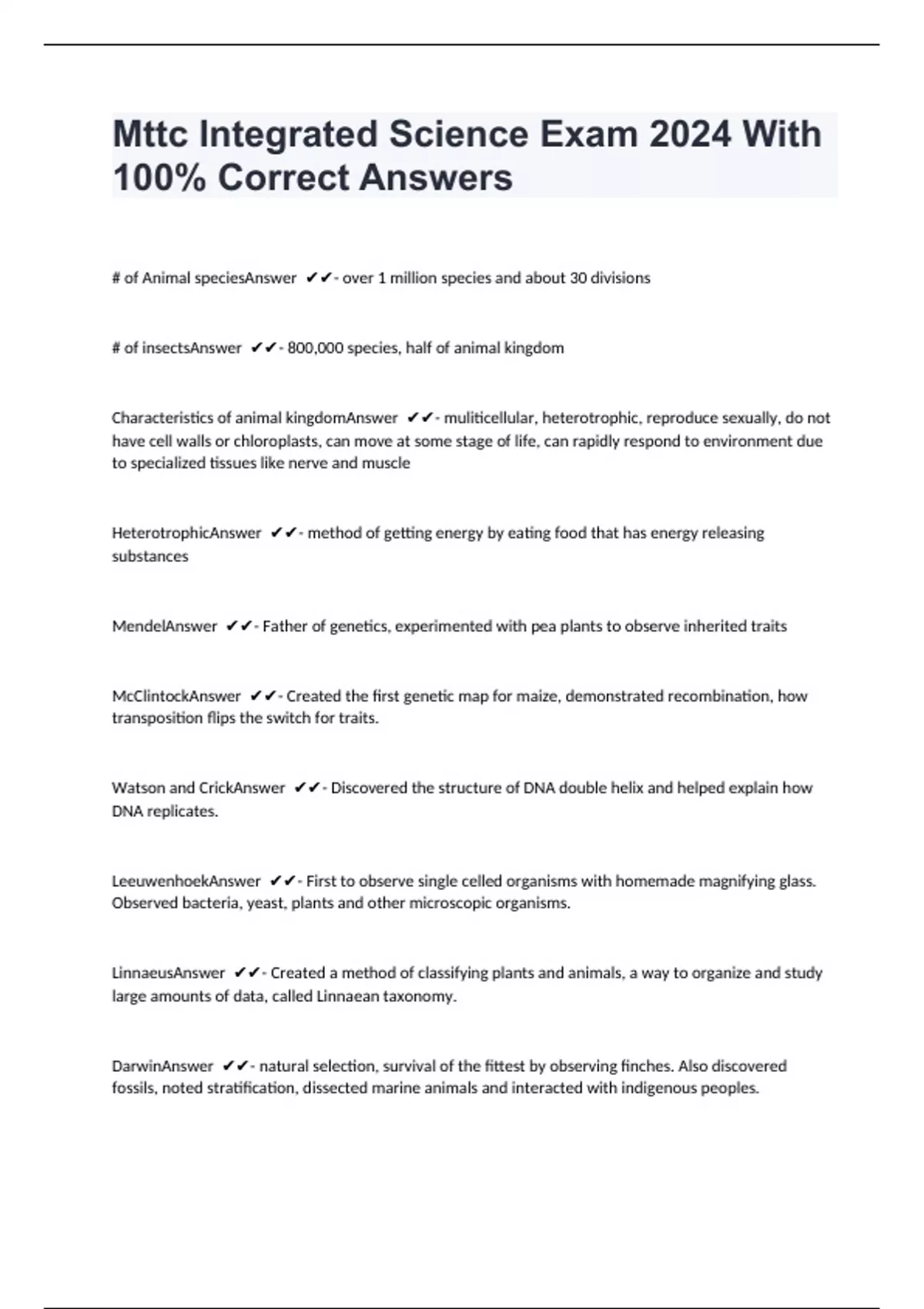 # of Animal speciesAnswer - over 1 million species and about 30 divisions # of insectsAnswer - 800,000 species, half of animal kingdom Characteristics of animal kingdomAnswer - muliticellular, heterotrophic, reproduce sexually, do not have cell walls or chloroplasts, can move at some stage of life, can rapidly respond to environment due to specialized tissues like nerve and muscle HeterotrophicAnswer - method of getting energy by eating food that has energy releasing substances MendelAnswer - Father of genetics, experimented with pea plants to observe inherited traits McClintockAnswer - Created the first genetic map for maize, demonstrated recombination, how transposition flips the switch for traits. Watson and CrickAnswer - Discovered the structure of DNA double helix and helped explain how DNA replicates. LeeuwenhoekAnswer - First to observe single celled organisms with homemade magnifying glass. Observed bacteria, yeast, plants and other microscopic organisms.
