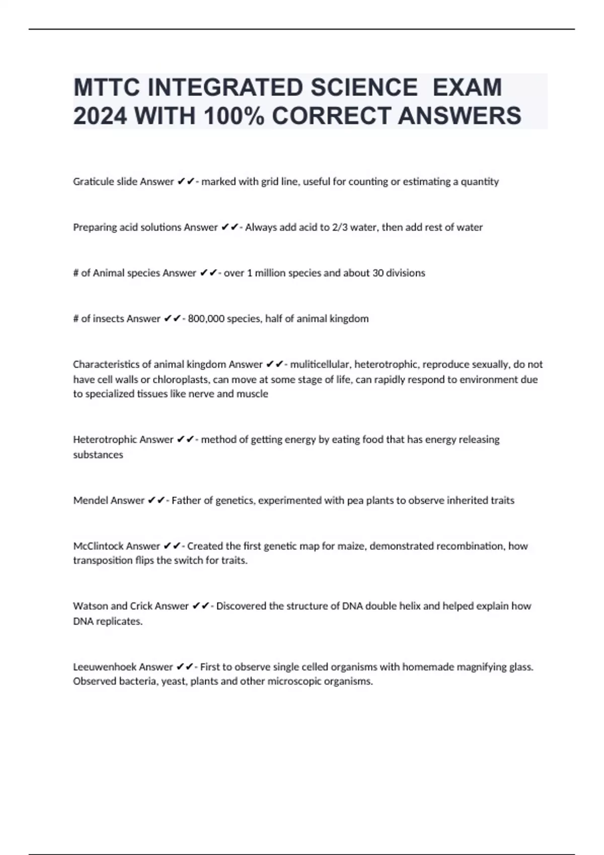 Graticule slide Answer - marked with grid line, useful for counting or estimating a quantity Preparing acid solutions Answer - Always add acid to 2/3 water, then add rest of water # of Animal species Answer - over 1 million species and about 30 divisions # of insects Answer - 800,000 species, half of animal kingdom Characteristics of animal kingdom Answer - muliticellular, heterotrophic, reproduce sexually, do not have cell walls or chloroplasts, can move at some stage of life, can rapidly respond to environment due to specialized tissues like nerve and muscle Heterotrophic Answer - method of getting energy by eating food that has energy releasing substances Mendel Answer - Father of genetics, experimented with pea plants to observe inherited traits McClintock Answer - Created the first genetic map for maize, demonstrated recombination, how transposition flips the switch for traits. Watson and Crick Answer - Discovered the structure of DNA double helix and helped explain how DNA replicates. Leeuwenhoek Answer - First to observe single celled organisms with homemade magnifying glass. Observed bacteria, yeast, plants and other microscopic organisms.