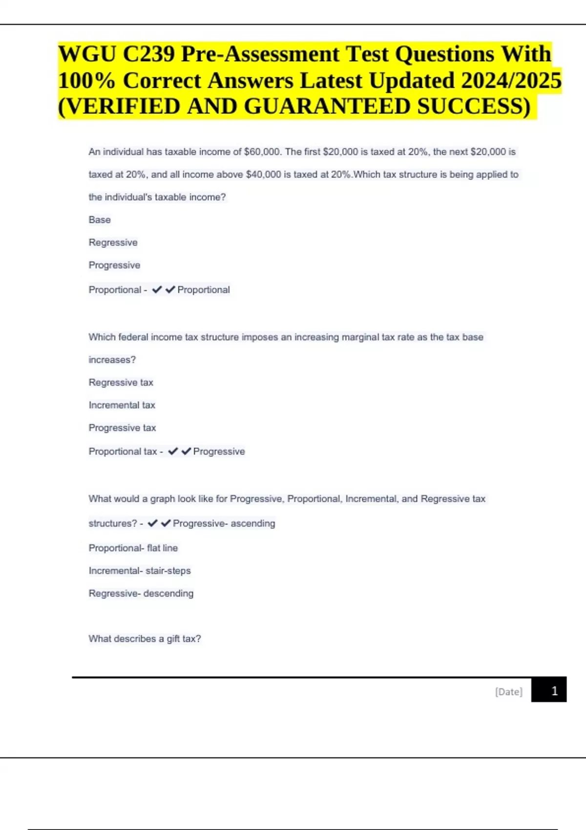WGU C239 Pre-Assessment Test Questions With Correct Answers Latest Updated 2024/2025 (100% VERIFIED) An individual has taxable income of $60,000. The first $20,000 is taxed at 20%, the next $20,000 is taxed at 20%, and all income above $40,000 is taxed at 20%.Which tax structure is being applied to the individual's taxable income? Base Regressive Progressive Proportional - ️️Proportional Which federal income tax structure imposes an increasing marginal tax rate as the tax base increases? Regressive tax Incremental tax Progressive tax Proportional tax - ️️Progressive What would a graph look like for Progressive, Proportional, Incremental, and Regressive tax structures? - ️️Progressive- ascending Proportional- flat line Incremental- stair-steps Regressive- descending What describes a gift tax? WGU C239 Pre-Assessment Test Questions With 100% Correct Answers Latest Updated 2024/2025 (VERIFIED AND GUARANTEED SUCCESS) [Date] 2 Tax on the retail sale of particular products Tax on the fair market value of wealth transfers Tax on the retail price of goods and services Tax on income earned by an individual - ️️Tax on the fair market value of wealth transfers What is a key element of an economy tax structure? Attracts and stimulates investment Helps ensure equality and ability to pay Assists in reducing unemployment and inflation Requires minimal compliance and administration costs - ️️Requires minimal compliance and administration costs Which objective of the federal tax law requires that a good tax system minimizes the compliance and administration costs? Equity Convenience Certainty Economy - ️️Economy Consider how the tax burden should be distributed across taxpayers - ️️Questions of Equity Means taxpayers should be able to determine when, where, and how much to pay - ️️Certainty [Date] 3 A tax system should minimize compliance and administration costs - ️️Convenience Which partnership item would flow through to an individual's tax return? Capital gains Gross income Partnership exemptions Dividends received deduction - ️️Capital Gains An Eleventh Circuit client who files in the U.S. Court of Federal Claims wants to know whether to include the terms of multiple options to renew a sale-leaseback to calculate a deduction. What is the authoritative reference? A Second Circuit case which used disjunctive analysis A tax court decision which used economic substance An Eleventh Circuit Case which analyzed sale-leaseback transactions that generate tax deductions A U.S. Court of Federal Claims case which analyzed sale-leaseback transactions for operating equipment - ️️A U.S. Court of Federal Claims case which analyzed sale-leaseback transactions for operating equipment Which tax rate calculation is an appropriate step in tax planning strategy to reduce tax? [Date] 4 The average tax rate, because it represents the percent of tax on each dollar The tax-exempt tax rate, because effective tax planning utilizes tax exempt bonds The effective tax rate, because economic income is less broad than taxable income The marginal tax rate, because it represents the tax applicable to the next taxable dollar - ️️The marginal tax rate, because it represents the tax applicable to the next taxable dollar Where is a corporation's non-business income allocated when computing the corporation's state taxable income? To multiple states per the functional test To one state per the transaction test To the state of the corporate headquarters of the payer To each state where the income is earned - ️️To the state of the corporate headquarters of the payer What is a key operating element of doing business as an S corporation? Fiscal year ends can be chosen without establishing a business purpose. Corporate profits are taxed at the shareholders level in the year earned. Shareholders are not subject to the at-risk or passive activity limitations. Nontaxable fringe benefits are available to S corporation employee shareholders. - ️️Corporate profits are taxed at the shareholders level in the year earned.