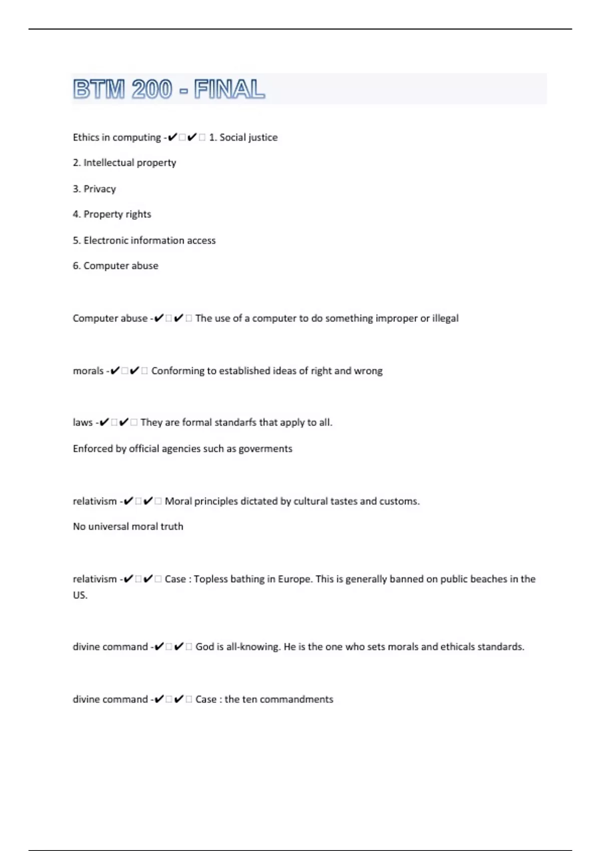Ethics in computing -️️ 1. Social justice 2. Intellectual property 3. Privacy 4. Property rights 5. Electronic information access 6. Computer abuse Computer abuse -️️ The use of a computer to do something improper or illegal morals -️️ Conforming to established ideas of right and wrong laws -️️ They are formal standarfs that apply to all. Enforced by official agencies such as goverments relativism -️️ Moral principles dictated by cultural tastes and customs. No universal moral truth relativism -️️ Case : Topless bathing in Europe. This is generally banned on public beaches in the US. divine command -️️ God is all-knowing. He is the one who sets morals and ethicals standards. divine command -️️ Case : the ten commandments
