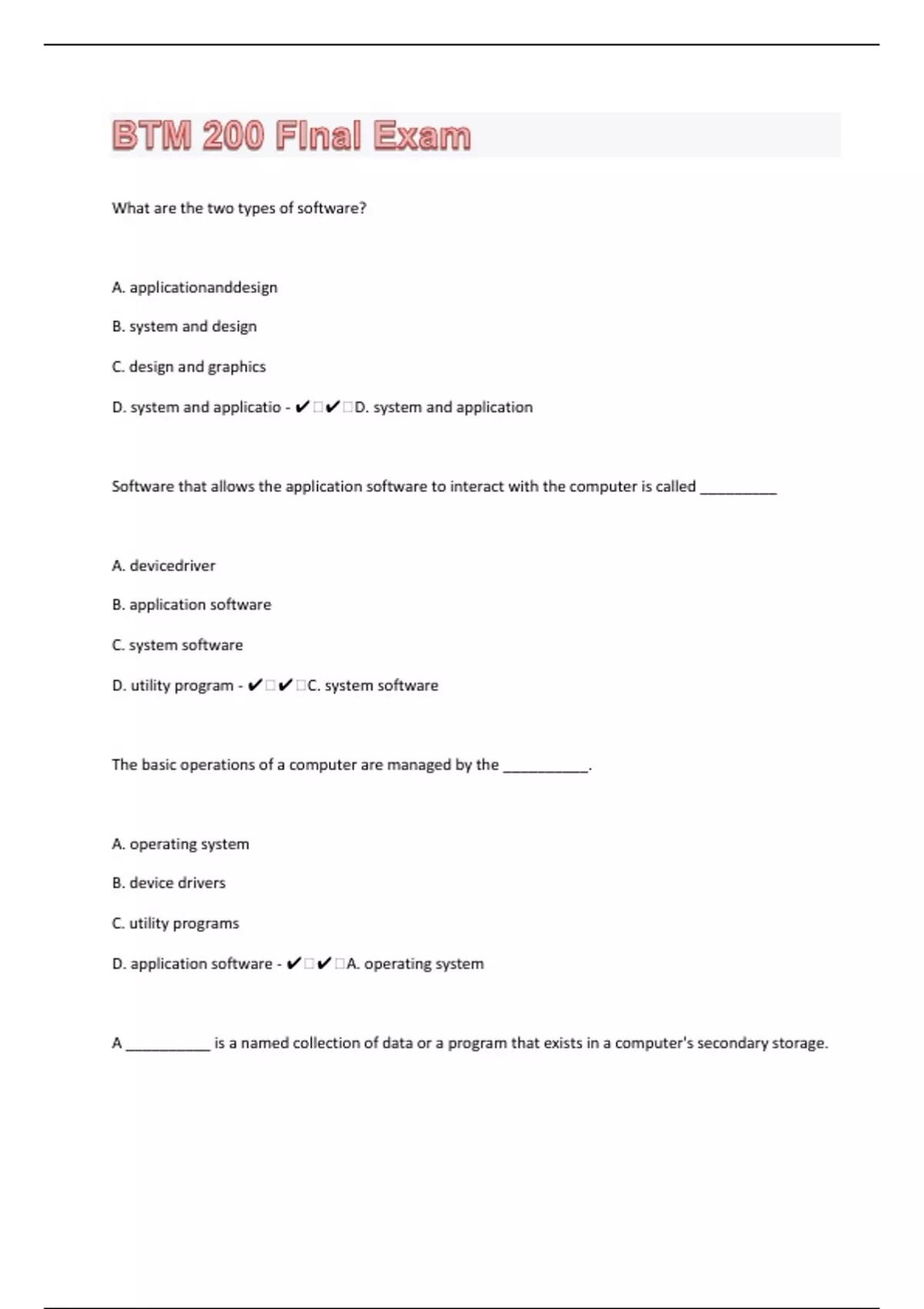 What are the two types of software? A. applicationanddesign B. system and design C. design and graphics D. system and applicatio - ️️D. system and application Software that allows the application software to interact with the computer is called _________ A. devicedriver B. application software C. system software D. utility program - ️️C. system software The basic operations of a computer are managed by the __________. A. operating system B. device drivers C. utility programs D. application software - ️️A. operating system A __________ is a named collection of data or a program that exists in a computer's secondary storage.