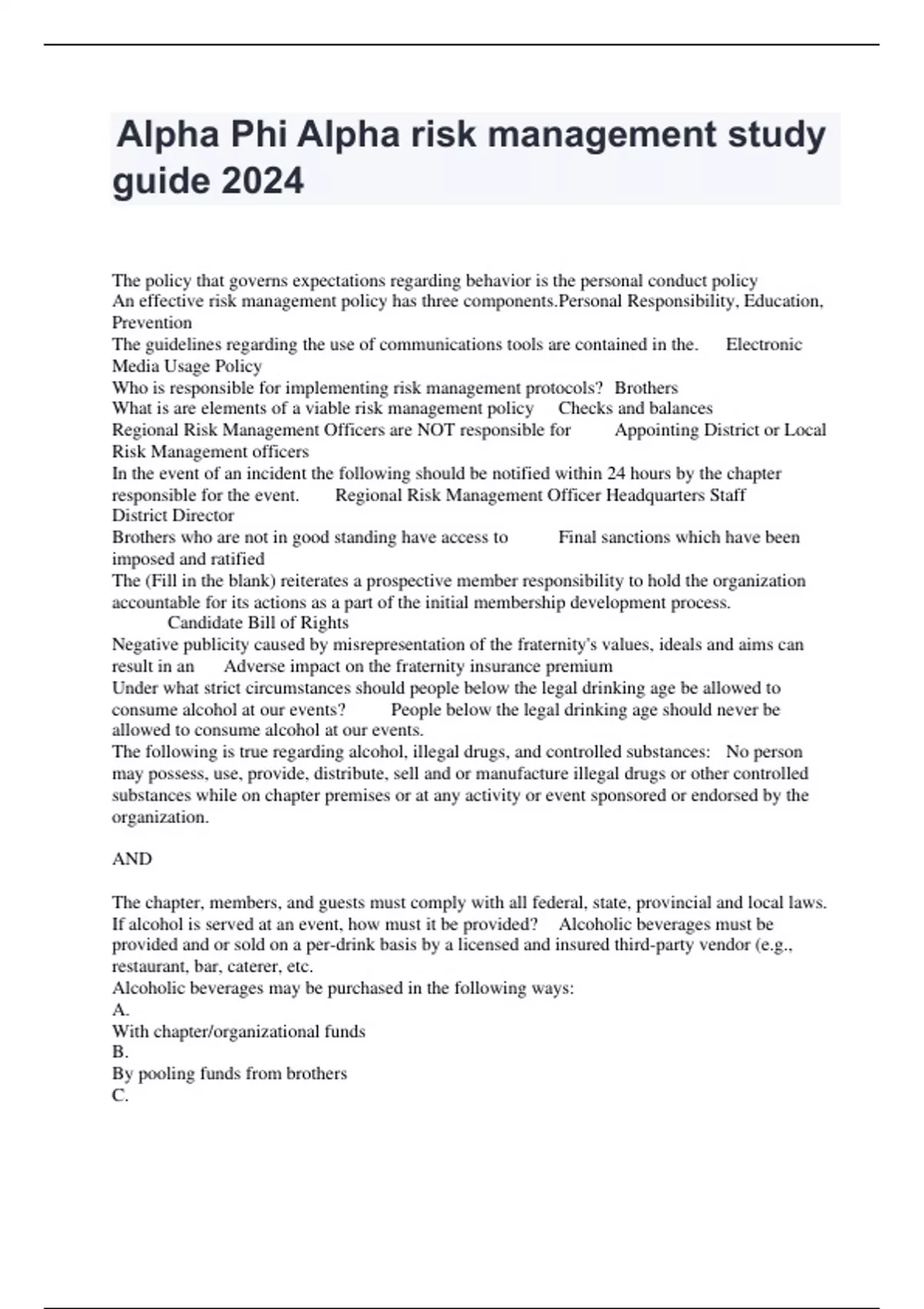 The policy that governs expectations regarding behavior is the personal conduct policy An effective risk management policy has three components. Personal Responsibility, Education, Prevention The guidelines regarding the use of communications tools are contained in the. Electronic Media Usage Policy Who is responsible for implementing risk management protocols? Brothers What is are elements of a viable risk management policy Checks and balances Regional Risk Management Officers are NOT responsible for Appointing District or Local Risk Management officers In the event of an incident the following should be notified within 24 hours by the chapter responsible for the event. Regional Risk Management Officer Headquarters Staff District Director Brothers who are not in good standing have access to Final sanctions which have been imposed and ratified The (Fill in the blank) reiterates a prospective member responsibility to hold the organization accountable for its actions as a part of the initial membership development process. Candidate Bill of Rights Negative publicity caused by misrepresentation of the fraternity's values, ideals and aims can result in an Adverse impact on the fraternity insurance premium Under what strict circumstances should people below the legal drinking age be allowed to consume alcohol at our events? People below the legal drinking age should never be allowed to consume alcohol at our events. The following is true regarding alcohol, illegal drugs, and controlled substances: No person may possess, use, provide, distribute, sell and or manufacture illegal drugs or other controlled substances while on chapter premises or at any activity or event sponsored or endorsed by the organization. AND The chapter, members, and guests must comply with all federal, state, provincial and local laws. If alcohol is served at an event, how must it be provided? Alcoholic beverages must be provided and or sold on a per-drink basis by a licensed and insured third-party vendor (e.g., restaurant, bar, caterer, etc. Alcoholic beverages may be purchased in the following ways: A. With chapter/organizational funds B. By pooling funds from brothers C. By collecting funds from guests (e.g. admission fees, cover fees, collecting funds through digital apps, etc.). D. Both B and C E. Neither of the above Answer: Neither of the above Which of the following is true about hosting events that serve alcohol: A. A-chapter must not host or sponsor but may co-host, co-sponsor, or participate in an activity or event with another group or entity that purchases or provides alcohol in ways that are against the fraternity's policies. B. Chapters should neither host, sponsor, co-host, co-sponsor, nor participate in an activity or event with another group or entity that purchases or provides alcohol in ways that are against the fraternity's policies. C. A chapter must not host or sponsor but may co-host, co-sponsor, or participate i n an activity or event with another group or entity that purchases or provides alcohol in ways that are against the fraternity's policies, as long as they have approval from your Regional Vice President. D. Chapters may submit a waiver to corporate headquarters to host, sponsor, co-host, or co-sponsor activity or event with another Answer: Chapters should neither host, sponsor, co-host, co-sponsor, nor participate in an activity or event with another group or entity that purchases or provides alcohol in ways that are against the fraternity's policies. Which of the following IMDP related events can have alcohol served? A. Smoker. b. During any officially sanctioned portion of IMDP. C .The ritual celebration. d. After the business of the Sphinx Club and Probate Club meetings is handled. e. None of the above. Answer: None of the above. What is the fraternity's alcohol education and awareness program that is required for all chapters to implement and is a condition of IMDP approval? A. Can't Drive Program (CDP) B. Cannon-Dozier Project (CDP) C. Canthony-Dozier Project (CDP) D. Cannon-Davenport Project (CDP) Answer: Cannon-Dozier Project (CDP)