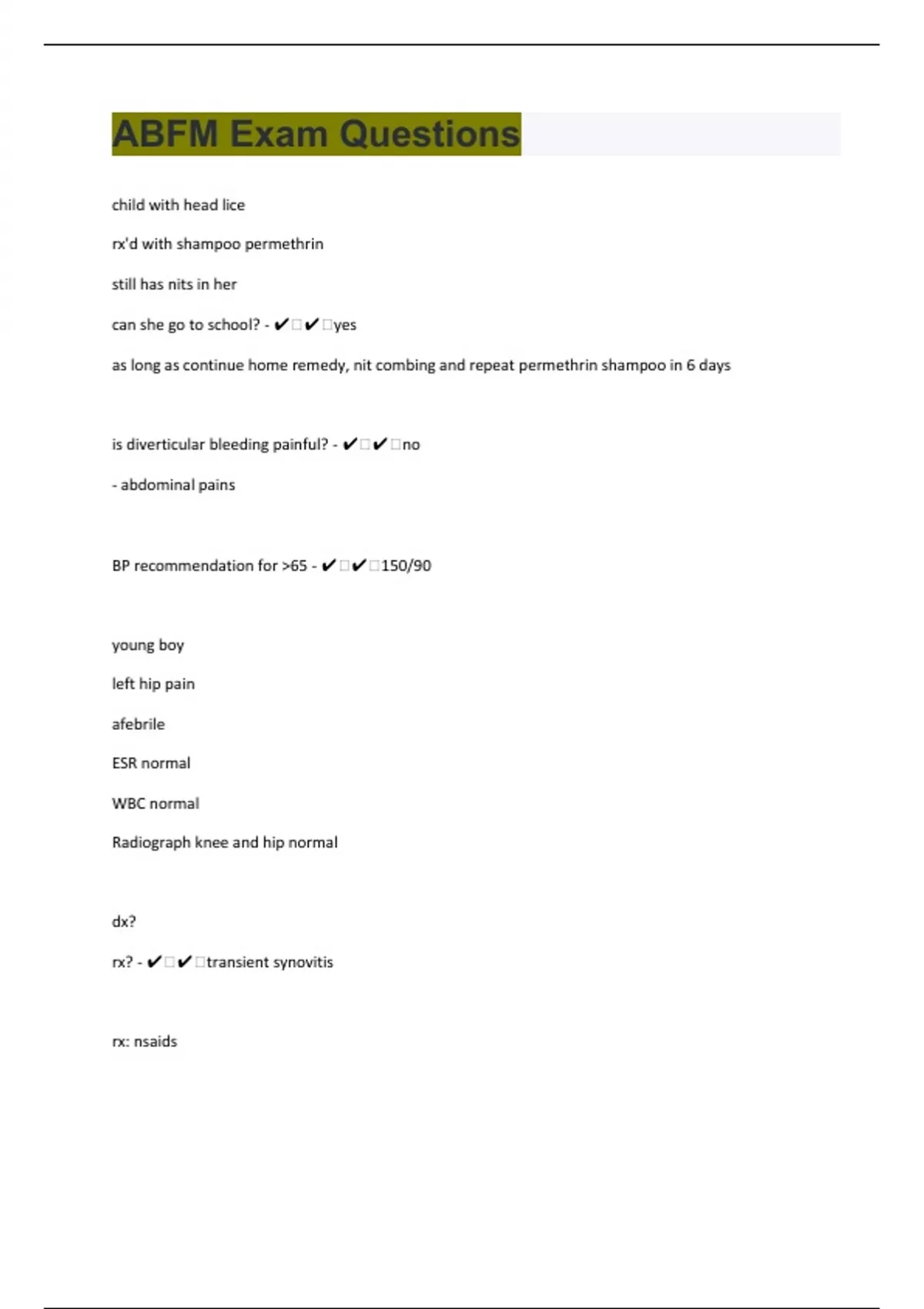 child with head lice rx'd with shampoo permethrin still has nits in her can she go to school? - ️️yes as long as continue home remedy, nit combing and repeat permethrin shampoo in 6 days is diverticular bleeding painful? - ️️no - abdominal pains BP recommendation for >65 - ️️150/90 young boy left hip pain afebrile ESR normal WBC normal Radiograph knee and hip normal dx? rx? - ️️transient synovitis rx: nsaids