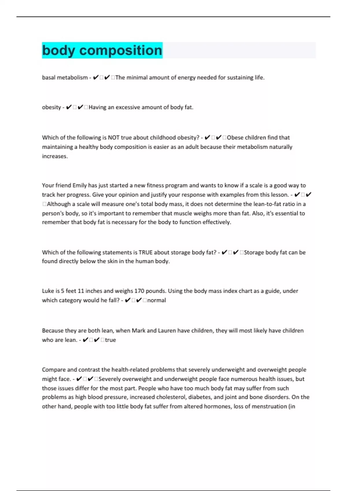 basal metabolism - ️️The minimal amount of energy needed for sustaining life. obesity - ️️Having an excessive amount of body fat. Which of the following is NOT true about childhood obesity? - ️️Obese children find that maintaining a healthy body composition is easier as an adult because their metabolism naturally increases. Your friend Emily has just started a new fitness program and wants to know if a scale is a good way to track her progress. Give your opinion and justify your response with examples from this lesson. - ️️Although a scale will measure one's total body mass, it does not determine the lean-to-fat ratio in a person's body, so it's important to remember that muscle weighs more than fat. Also, it's essential to remember that body fat is necessary for the body to function effectively. Which of the following statements is TRUE about storage body fat? - ️️Storage body fat can be found directly below the skin in the human body. Luke is 5 feet 11 inches and weighs 170 pounds. Using the body mass index chart as a guide, under which category would he fall? - ️️normal Because they are both lean, when Mark and Lauren have children, they will most likely have children who are lean. - ️️true Compare and contrast the health-related problems that severely underweight and overweight people might face. - ️️Severely overweight and underweight people face numerous health issues, but those issues differ for the most part. People who have too much body fat may suffer from such problems as high blood pressure, increased cholesterol, diabetes, and joint and bone disorders. On the other hand, people with too little body fat suffer from altered hormones, loss of menstruation (in women), osteoporosis, and organ failure. The one major consequence that both severely overweight and underweight people face is death.