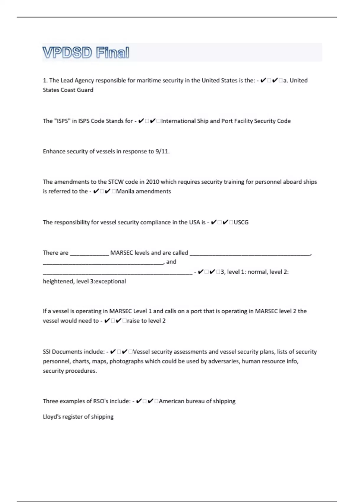 1. The Lead Agency responsible for maritime security in the United States is the: - ️️a. United States Coast Guard The "ISPS" in ISPS Code Stands for - ️️International Ship and Port Facility Security Code Enhance security of vessels in response to 9/11. The amendments to the STCW code in 2010 which requires security training for personnel aboard ships is referred to the - ️️Manila amendments The responsibility for vessel security compliance in the USA is - ️️USCG There are ____________ MARSEC levels and are called _____________________________________, _____________________________________, and ______________________________________________ - ️️3, level 1: normal, level 2: heightened, level 3:exceptional If a vessel is operating in MARSEC Level 1 and calls on a port that is operating in MARSEC level 2 the vessel would need to - ️️raise to level 2 SSI Documents include: - ️️Vessel security assessments and vessel security plans, lists of security personnel, charts, maps, photographs which could be used by adversaries, human resource info, security procedures. Three examples of RSO's include: - ️️American bureau of shipping Lloyd's register of shipping Det Norske Veritas Bureau Veritas