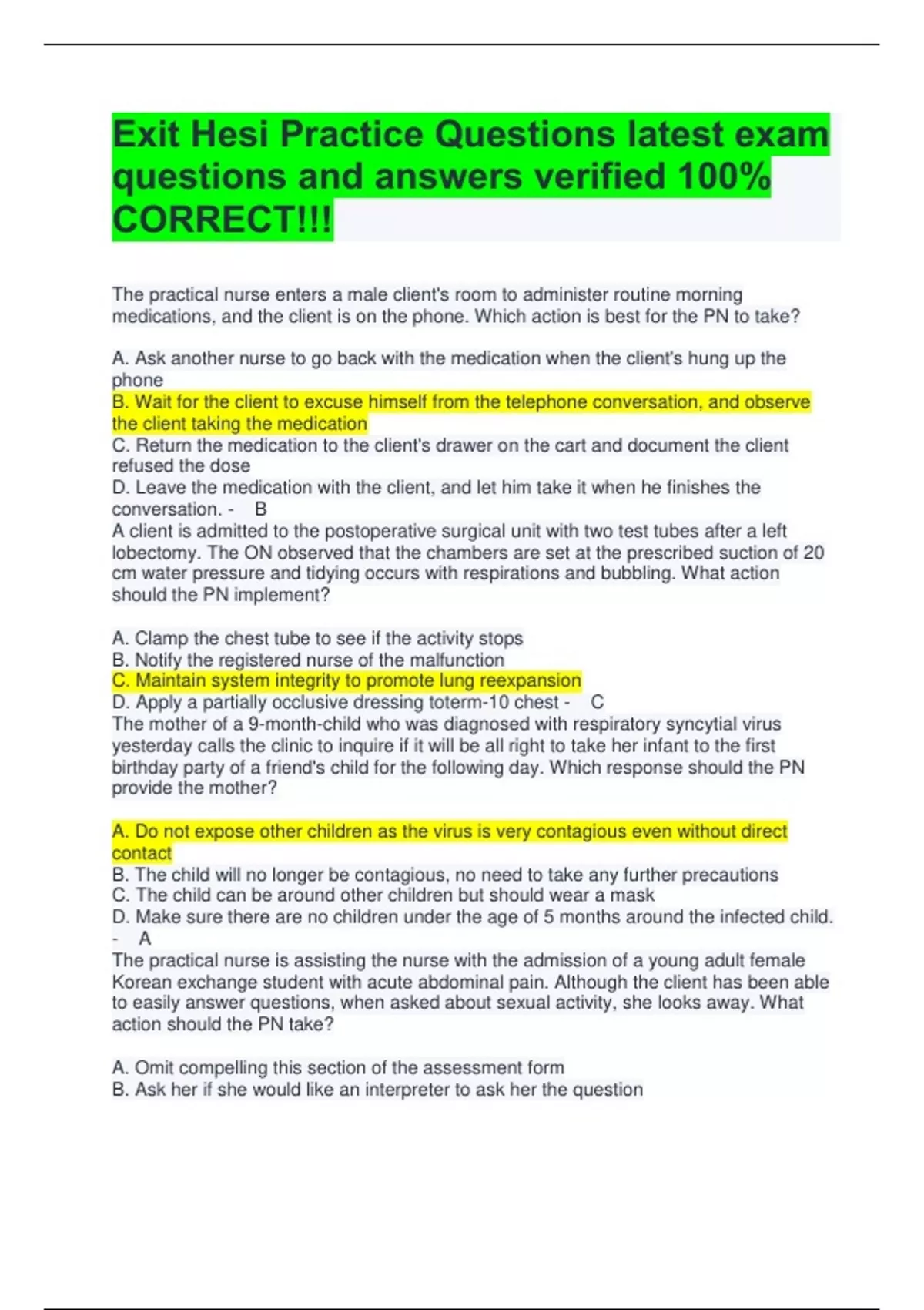 Exit Hesi Practice Questions latest exam questions and answers verified 100% CORRECT!!! The practical nurse enters a male client's room to administer routine morning medications, and the client is on the phone. Which action is best for the PN to take? A. Ask another nurse to go back with the medication when the client's hung up the phone B. Wait for the client to excuse himself from the telephone conversation, and observe the client taking the medication C. Return the medication to the client's drawer on the cart and document the client refused the dose D. Leave the medication with the client, and let him take it when he finishes the conversation. - B A client is admitted to the postoperative surgical unit with two test tubes after a left lobectomy. The ON observed that the chambers are set at the prescribed suction of 20 cm water pressure and tidying occurs with respirations and bubbling. What action should the PN implement? A. Clamp the chest tube to see if the activity stops B. Notify the registered nurse of the malfunction C. Maintain system integrity to promote lung reexpansion D. Apply a partially occlusive dressing toterm-10 chest - C The mother of a 9-month-child who was diagnosed with respiratory syncytial virus yesterday calls the clinic to inquire if it will be all right to take her infant to the first birthday party of a friend's child for the following day. Which response should the PN provide the mother? A. Do not expose other children as the virus is very contagious even without direct contact B. The child will no longer be contagious, no need to take any further precautions C. The child can be around other children but should wear a mask D. Make sure there are no children under the age of 5 months around the infected child. - A The practical nurse is assisting the nurse with the admission of a young adult female Korean exchange student with acute abdominal pain. Although the client has been able to easily answer questions, when asked about sexual activity, she looks away. What action should the PN take? A. Omit compelling this section of the assessment form B. Ask her if she would like an interpreter to ask her the question C. Reword the question in case the client did not understand D. Watch the client's response when asked a different question - D During immediate postoperative period following a total hip placement, which intervention is most important for the PN to implement? A. Encourage client to use walker or cane when ambulating B. Keep client's hip aligned with knees abducted C. Teach client to sit on the side of the bed before standing D. Monitor urinary flow via indwelling catheter - B A client confides to the PN that the client has been substituting herbal supplements for high blood pressure instead of the prescribed medication. How should the PN respond first? A. Ask the client's reason for choosing to take herbs instead of prescribed drugs B. Reinforce that the healthcare provider prescribed the medication for a reason C. Have client use own words to describe complications of high blood pressure D. Point out the risks of not taking the herbal medications rather than prescribed - A The PN is assigned to administer medications in a long term care facility. A disoriented resident has no identification band or picture. What is the best nursing action for the PN to take prior administering the medications this resident? term-14 A. Ask a regular staff member to confirm the resident's identity B. Hold the medication until a family member again C. Re-orient the resident to name, place, and situation D. Confirm the room and bed numbers with those on the medication record. - D An adult client who weighs 150 pounds has partial-thickness and full-thickness burns over 40% of the body from a house fire. After admission, which observation is most important for the practical nurse to report immediately? A. Poor appetite and refusing to eat B. Systolic blood pressure at 102 C. Painful moaning and crying D. Urinary Output of 20ml/hr - D A 12-year-old child is receiving a blood transfusion per infusion pump and begins to complain of "itchy" skin 15 minutes after the unit of blood is started. The child appears flushed. What action should the practical nurse take first? A. Apply lotion to the skin B. Stop the transfusion C. Inspect the infusion site D. Obtain the vital signs - B A PN is competing a focused assessment of an older adult's skin. The PN notes a crusted 0.7 cm lesion on the client's forehead. Which action should the PN take in response to this finding? A. Report the finding to the healthcare provider B. Place a clear occlusive dressing over the site C. Apply a warm compress to remove the crusted area D. Explain that this is a normal skin change with aging - C While taking the vital signs of an older male client who takes psychotropic medications, the PN notes that he has uncontrollable hand movements and is excessively blinking his eyes. Which information in the client's medical record should the PN review? A. Prescription for lorazepam B. History of Parkinson's disease C. Screening for tardive dyskinesia D. Recent urine drug screen report - B The PN is caring for an elderly female client who tells the PN, "When I sneeze, I wet my pants." After discussing the client's complaint with the charge nurse, the PN plans to reinforce teaching that the client has received about the importance of Kegel exercises.WHat muscles are involved in these exercises? A. Pectoral muscles B. Buttock muscles C. Abdominal muscles D. Pelvic floor muscles - D While providing oral care for a client who is unconscious, the nurse positions the client laterally and uses a basin to collect secretions. Which intervention is best for the nurse to implement? A. Swab the oral cavity with a washcloth B. Use oral swabs with normal saline C. Provide a Yankauer tip for oral suction D. Support the head with a small pillow - B The practical nurse and unlicensed assistive personnel are providing care for a c