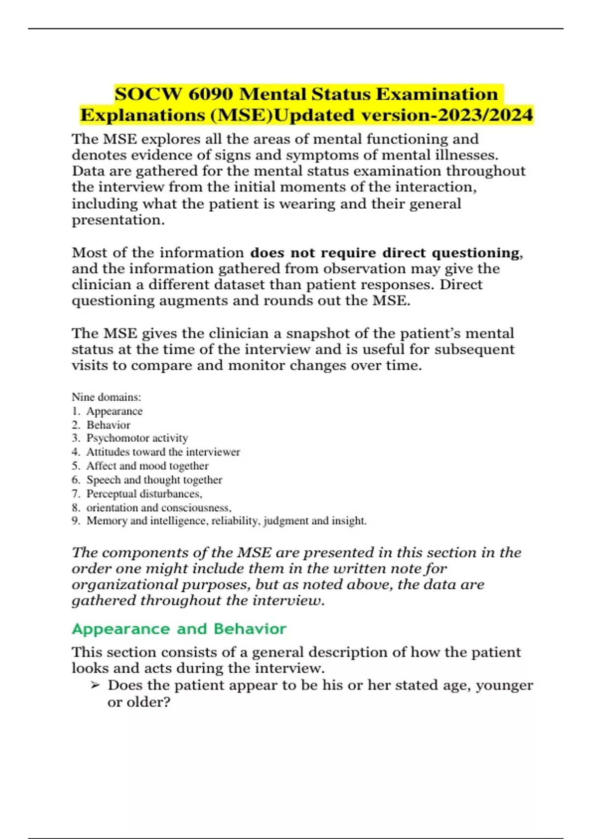 SOCW 6090 Mental Status Examination Explanations (MSE)Updated version-2023/2024