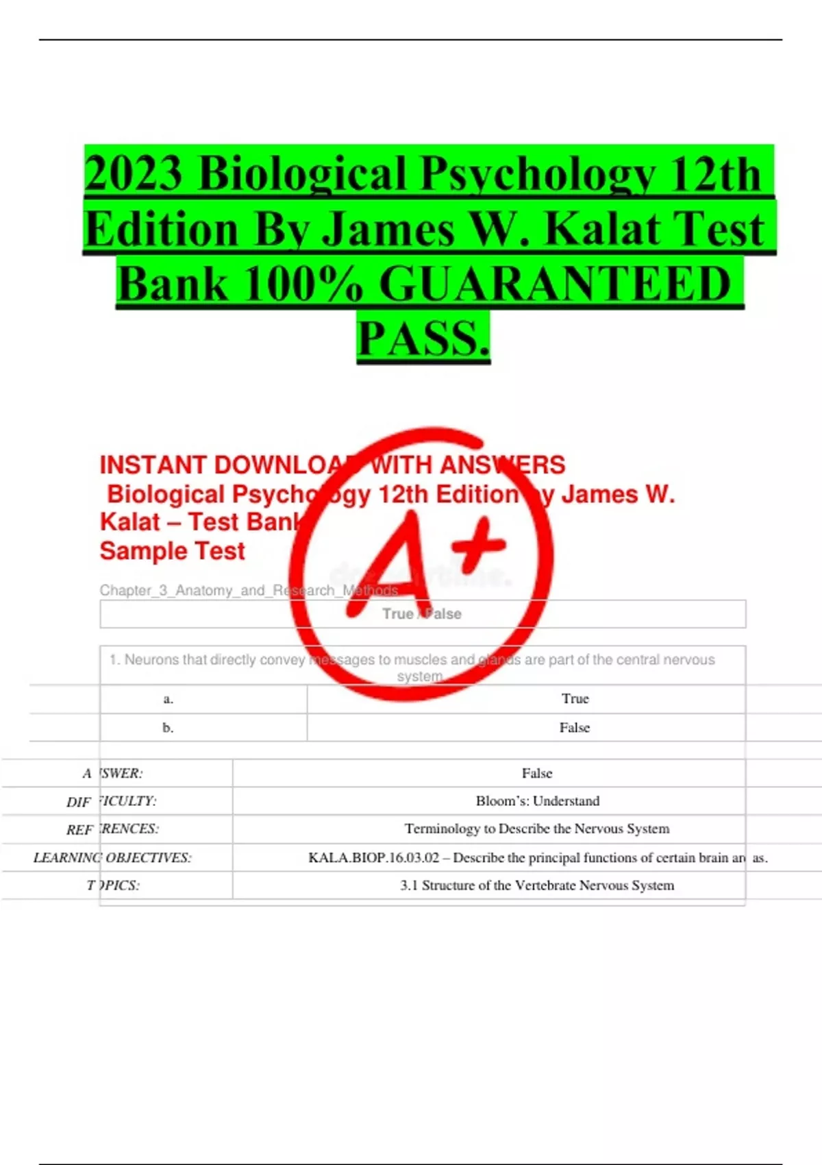 INSTANT DOWNLOAD WITH ANSWERS Biological Psychology 12th Edition by James W. Kalat – Test Bank Sample Test Chapter_3_Anatomy_and_Research_Methods True / False A DIF REF LEARNING T as. OPICS: 3.1 Structure of the Vertebrate Nervous System OBJECTIVES: KALA.BIOP.16.03.02 – Describe the principal functions of certain brain are ERENCES: Terminology to Describe the Nervous System FICULTY: Bloom’s: Understand NSWER: False b. False a. True 1. Neurons that directly convey messages to muscles and glands are part of the central nervous system. 5. Parasympathetic neurons use acetylcholine as their neurotransmitter. a. True b. False A DIF RE LEARNIN T y. OPICS: 3.1 Structure of the Vertebrate Nervous System G OBJECTIVES: KALA.BIOP.16.03.01 – Define the terms used to describe brain anatom FERENCES: Terminology to Describe the Nervous System FICULTY: Bloom’s: Analyze NSWER: False b. False a. True 2. The elbow is more distal to the shoulder than the hand. A DIF REF LEARNING T as. OPICS: 3.1 Structure of the Vertebrate Nervous System OBJECTIVES: KALA.BIOP.16.03.02 – Describe the principal functions of certain brain are ERENCES: The Spinal Cord FICULTY: Bloom’s: Understand NSWER: False b. False a. True 3. Cell bodies of motor neurons are located outside of the spinal cord. A DIF REF LEARNING T as. OPICS: 3.1 Structure of the Vertebrate Nervous System OBJECTIVES: KALA.BIOP.16.03.02 – Describe the principal functions of certain brain are ERENCES: The Autonomic Nervous System FICULTY: Bloom’s: Understand NSWER: False b. False a. True 4. The parasympathetic nervous system activates the “fight or flight” response. A DIF REF LEARNING T as. OPICS: 3.1 Structure of the Vertebrate Nervous System OBJECTIVES: KALA.BIOP.16.03.02 – Describe the principal functions of certain brain are ERENCES: The Autonomic Nervous System FICULTY: Bloom’s: Understand NSWER: True A DIF REF LEARNING T as. OPICS: 3.1 Structure of the Vertebrate Nervous System OBJECTIVES: KALA.BIOP.16.03.02 – Describe the principal functions of certain brain are ERENCES: The Hindbrain FICULTY: Bloom’s: Understand NSWER: True b. False a. True 6. The hindbrain consists of the medulla, the pons, and the cerebellum. A DIF REF LEARNING T as. OPICS: 3.1 Structure of the Vertebrate Nervous System OBJECTIVES: KALA.BIOP.16.03.02 – Describe the principal functions of certain brain are ERENCES: The Hindbrain FICULTY: Bloom’s: Understand NSWER: True b. False a. True 7. Some cranial nerves include both sensory and motor components. A DIFFICULTY: Bloom’s: Understand