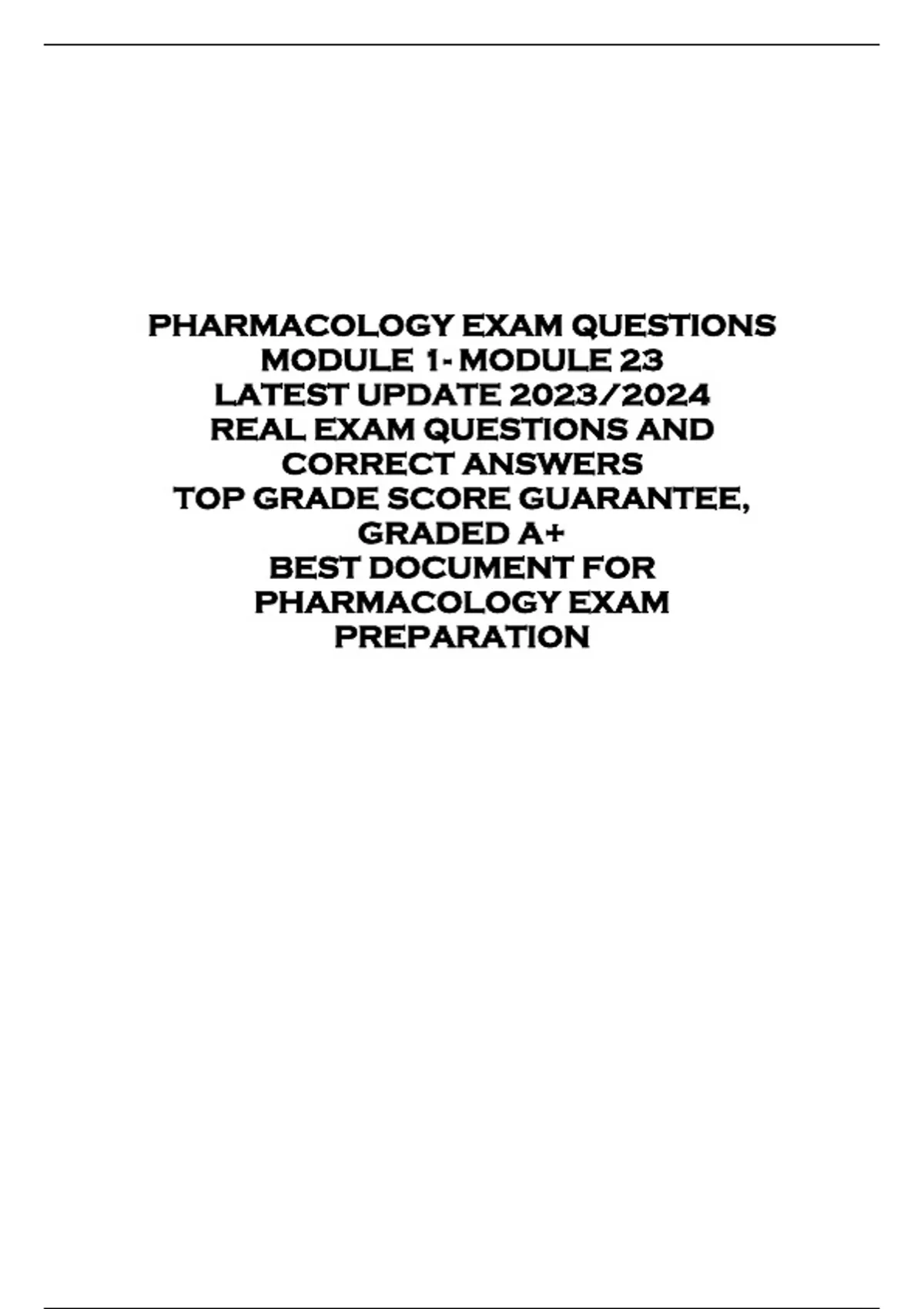 PHARMACOLOGY EXAM QUESTIONS MODULE 1- MODULE 23 LATEST UPDATE 2023/2024 REAL EXAM QUESTIONS AND CORRECT ANSWERS TOP GRADE SCORE GUARANTEE, GRADED A+ BEST DOCUMENT FOR PHARMACOLOGY EXAM PREPARATION