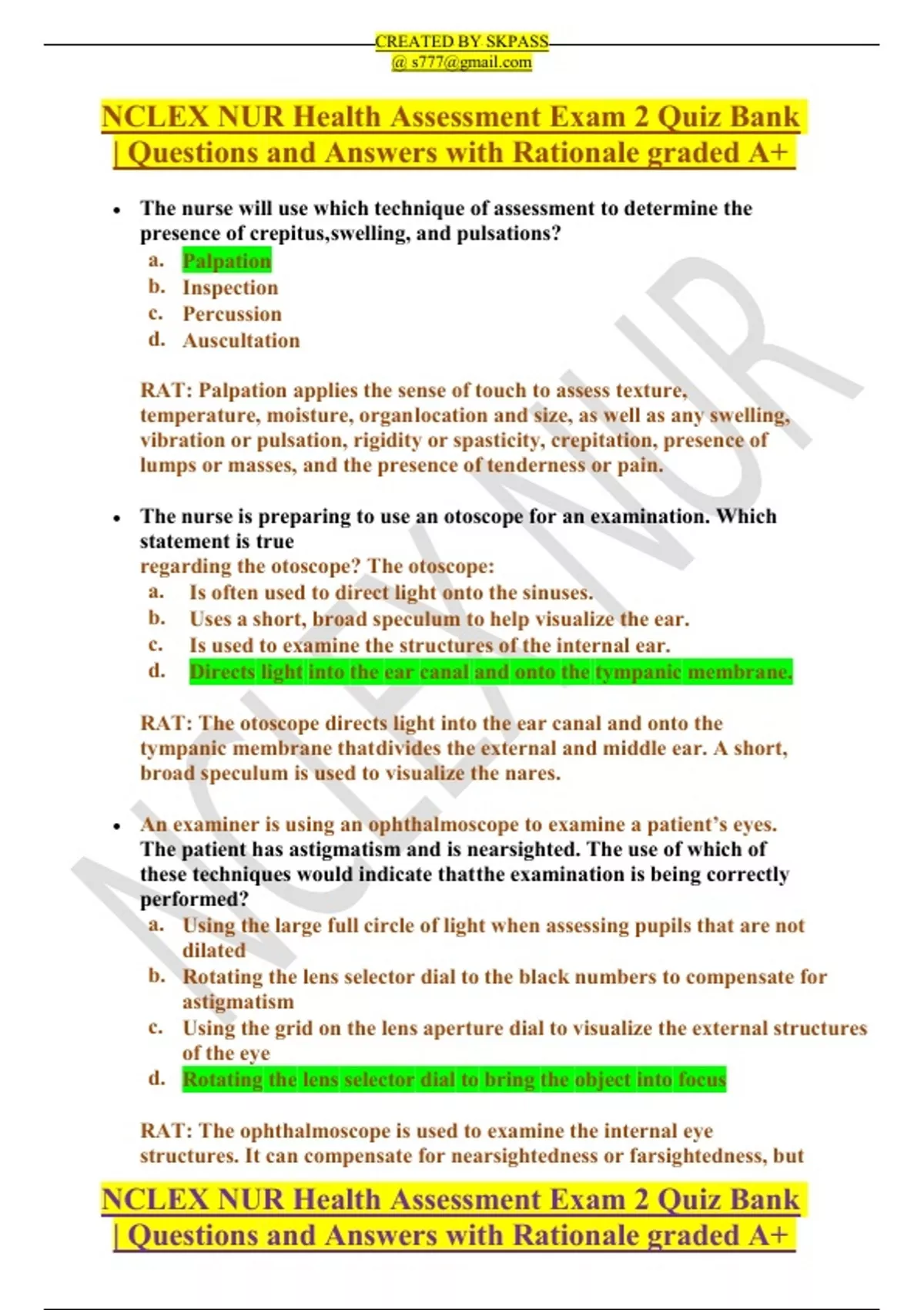 NCLEX NUR Health Assessment Exam 2 Quiz Bank | Questions and Answers with Rationale graded A+ The nurse will use which technique of assessment to determine the presence of crepitus, swelling, and pulsations? a.Palpation b.Inspection c.Percussion d.Auscultation RAT: Palpation applies the sense of touch to assess texture, temperature, moisture, organ location and size, as well as any swelling, vibration or pulsation, rigidity or spasticity, crepitation, presence of lumps or masses, and the presence of tenderness or pain. The nurse is preparing to use an otoscope for an examination. Which statement is true regarding the otoscope? The otoscope: a.Is often used to direct light onto the sinuses. b.Uses a short, broad speculum to help visualize the ear. c.Is used to examine the structures of the internal ear. d.Directs light into the ear canal and onto the tympanic membrane. RAT: The otoscope directs light into the ear canal and onto the tympanic membrane that divides the external and middle ear. A short, broad speculum is used to visualize the nares. An examiner is using an ophthalmoscope to examine a patient’s eyes. The patient has astigmatism and is nearsighted. The use of which of these techniques would indicate that the examination is being correctly performed? a.Using the large full circle of light when assessing pupils that are not dilated b.Rotating the lens selector dial to the black numbers to compensate for astigmatism c.Using the grid on the lens aperture dial to visualize the external structures of the eye d.Rotating the lens selector dial to bring the object into focus RAT: The ophthalmoscope is used to examine the internal eye structures. It can compensate for nearsightedness or farsightedness, but it will not correct for astigmatism. The grid is used to assess size and location of lesions on the fundus. The large full spot of light is used to assess dilated pupils. Rotating the lens selector dial brings the object into focus. A man is at the clinic for a physical examination. He states that he is “very anxious” about the physical examination. What steps can the nurse take to make him more comfortable? a.Appear unhurried and confident when examining him. b.Stay in the room when he undresses in case he needs assistance. c.Ask him to change into an examining gown and to take off his undergarments. d.Defer measuring vital signs until the end of the examination, which allows him time to become comfortable. RAT: Anxiety can be reduced by an examiner who is confident, self-assured, considerate, and unhurried. Familiar and relatively nonthreatening actions, such as measuring the person’s vital signs, will gradually accustom the person to the examination.