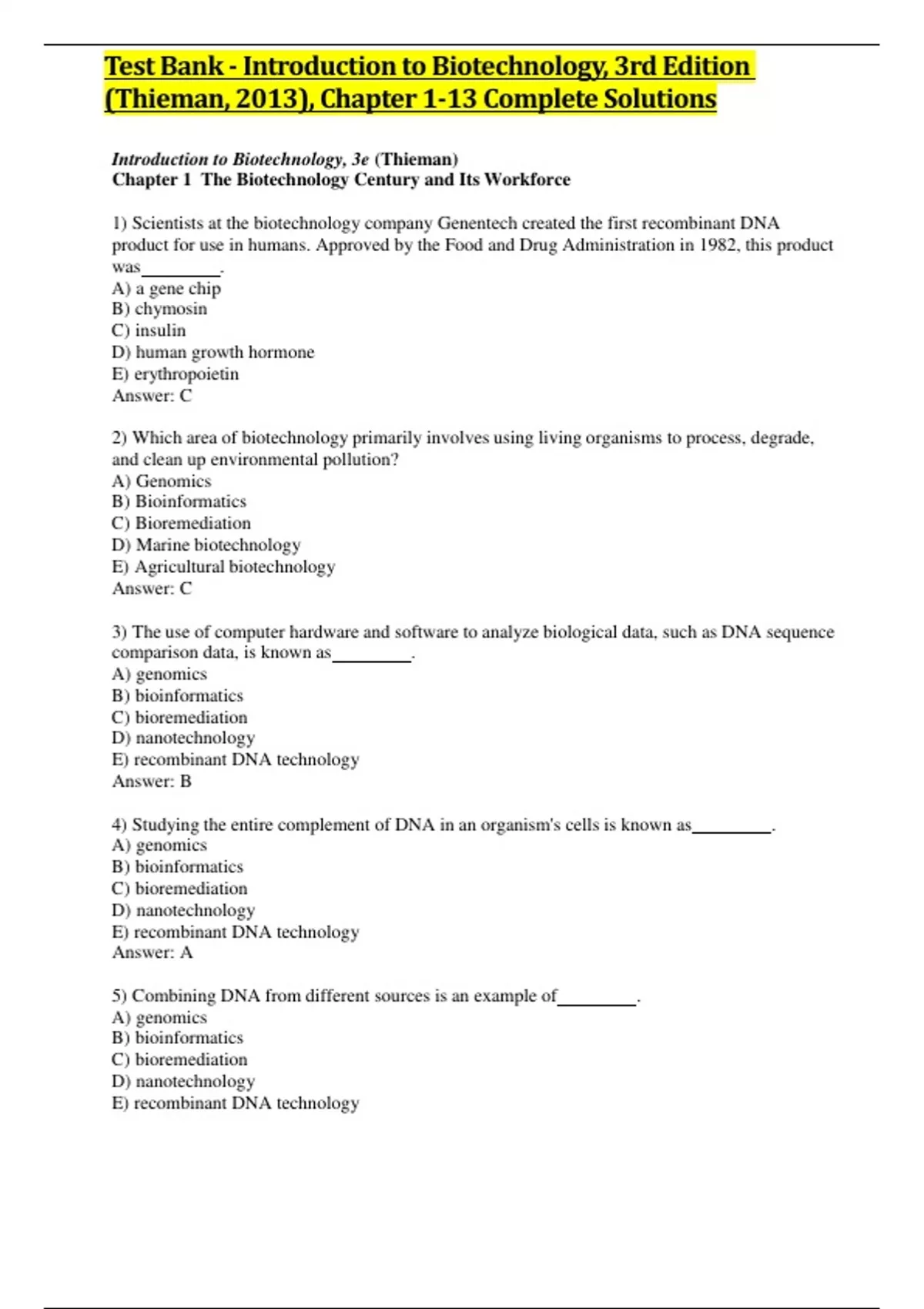 Test Bank - Introduction to Biotechnology, 4th Edition (Thieman, 2019), Chapter 1-13 | All Chapters