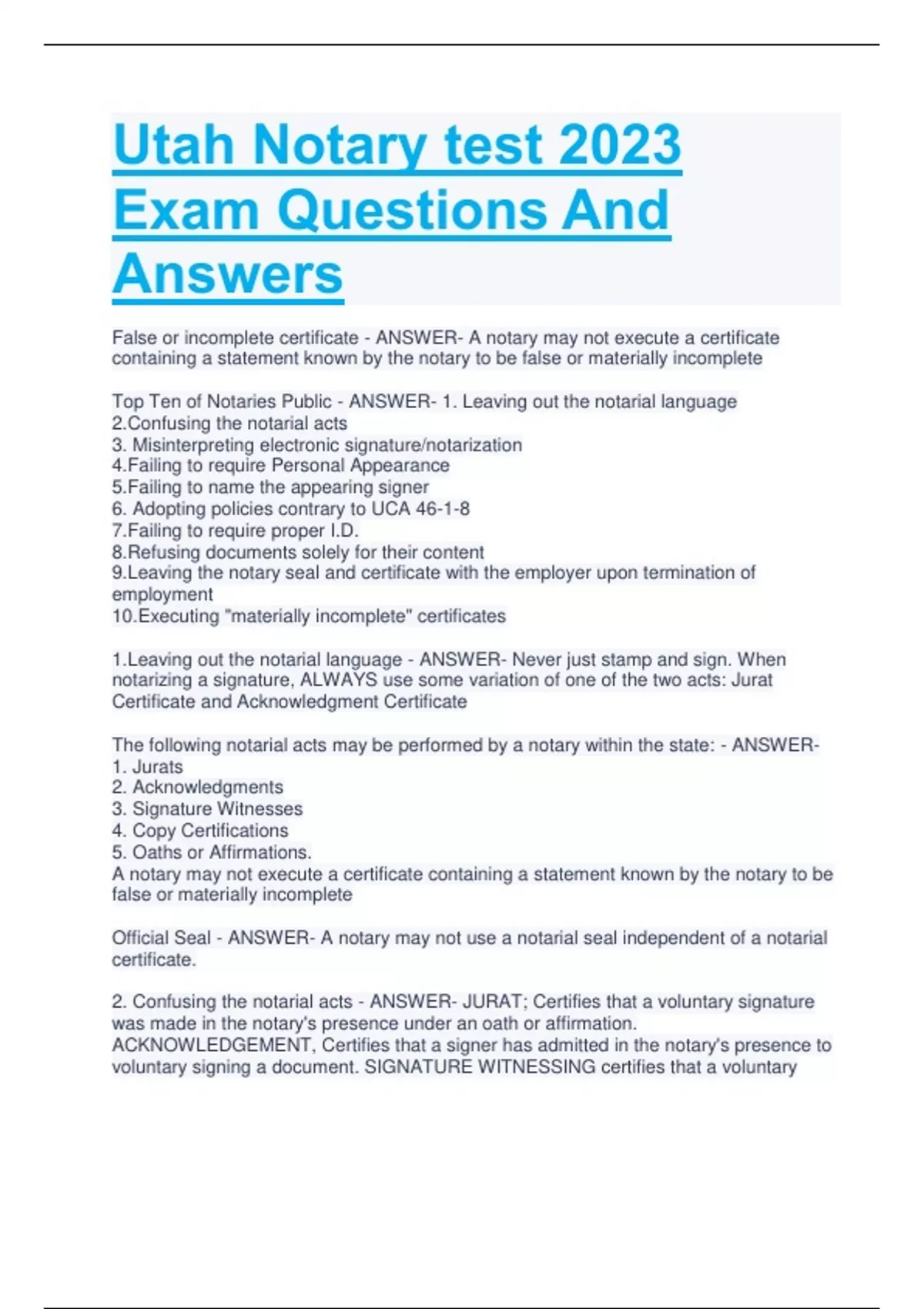 Utah Notary test 2023 Exam Questions And Answers False or incomplete certificate - ANSWER- A notary may not execute a certificate containing a statement known by the notary to be false or materially incomplete Top Ten of Notaries Public - ANSWER- 1. Leaving out the notarial language 2.Confusing the notarial acts 3. Misinterpreting electronic signature/notarization 4.Failing to require Personal Appearance 5.Failing to name the appearing signer 6. Adopting policies contrary to UCA 46-1-8 7.Failing to require proper I.D. 8.Refusing documents solely for their content 9.Leaving the notary seal and certificate with the employer upon termination of employment 10.Executing "materially incomplete" certificates 1.Leaving out the notarial language - ANSWER- Never just stamp and sign. When notarizing a signature, ALWAYS use some variation of one of the two acts: Jurat Certificate and Acknowledgment Certificate The following notarial acts may be performed by a notary within the state: - ANSWER1. Jurats 2. Acknowledgments 3. Signature Witnesses 4. Copy Certifications 5. Oaths or Affirmations. A notary may not execute a certificate containing a statement known by the notary to be false or materially incomplete Official Seal - ANSWER- A notary may not use a notarial seal independent of a notarial certificate. 2. Confusing the notarial acts - ANSWER- JURAT; Certifies that a voluntary signature was made in the notary's presence under an oath or affirmation. ACKNOWLEDGEMENT, Certifies that a signer has admitted in the notary's presence to voluntary signing a document. SIGNATURE WITNESSING certifies that a voluntary signature was made in the notary's presence. All 3 require personal appearance, and proof of identity Acknowledgement - ANSWER- Notarial act in which a notary certifies that a signer, whose identity is personally known to the notary or proven on the basis of satisfactory evidence, has admitted, in the presence of the notary, to voluntarily signing a document for the document's stated purpose Jurat - ANSWER- Notarial act in which a notary certifies that a signer, whose identity is personally known to the notary or proven on the basis of satisfactory evidence, has made, in the notary's presence, a voluntary signature and taken an oath of affirmation vouching for the truthfulness of the signed document. Signature Witnessing - ANSWER- Notarial act in which an individual: appears in person before a notary and presents a document; provides the notary satisfactory evidence of the individual's identity or is personally known to the notary; and signs the document in the presence of the notary 3. Misinterpreting electronic signature/notarization - ANSWER- Notarization of an electronic signature IS VERY RARE and still requires personal appearance. IT is a certification of a voluntary signature just the same as any other signature. DOES NOT mean by phone, fax, email or video conference. For elecetronic notarization, the signer is in the presence of the notary using a computer instead of pen and paper. THE RULE OF PERSONAL APPEARANCE IA NOT AFFECTED BY THE DEFINITION OF "ËLECTRONIC SIGNATURE" Electronic signature - ANSWER- means an electronic sound, symbol, of process attached to or logically associated with a record and executed or adopted by a person with the intent to sign the record 4. Failing to require Personal Appearance - ANSWER- The signer must always appear before the notary. Title 46 does not allow for variations on this matter. 5. Failing to name the appearing signer - ANSWER- When more than one signature appears on the document, omitting this material information often leads to confusion. Many fraud cases show that the "defrauder" was able to add a different name in the Jurat or Acknowledgement simply because the notary failed to include the correct name in the first place. A notary may not execute a certificate containing a statement known by the notary to be false or materially incomplete 6. Adopting policies contrary to UCA 46-1-8 - ANSWER- According to law, a notary may not refuse to enter into a lawful transaction involving a notarial act.. Do not adopt policies to refuse transactions unless there is a legal reason to do so. To "pick and choose" who is served based on personal preferences of prejudices is not legally justified. 7. Failing to require proper I.D. - ANSWER- VALID VERIFICATION .Passport (from this or any nation) .I.D. from government (U.S.any state within the U.S. of Foreign) with the following 3 items 1.Photograph 2.Signature 3.Physical Description NOT VALID .Driver's Privilege Card .Birth Certificate .Marriage License .Social Security any other document which does NOT meet the criteria for Valid Identification 8. Refusing documents solely for their content - ANSWER- regardless of the type of document, you may not refuse to enter into ä lawful transaction involving a notarial Act" What about documents in another language? You should not be reading the document anyway-even if it is in English. However, you must communicate sufficiently with the signer to ensure the signer signed voluntarily.