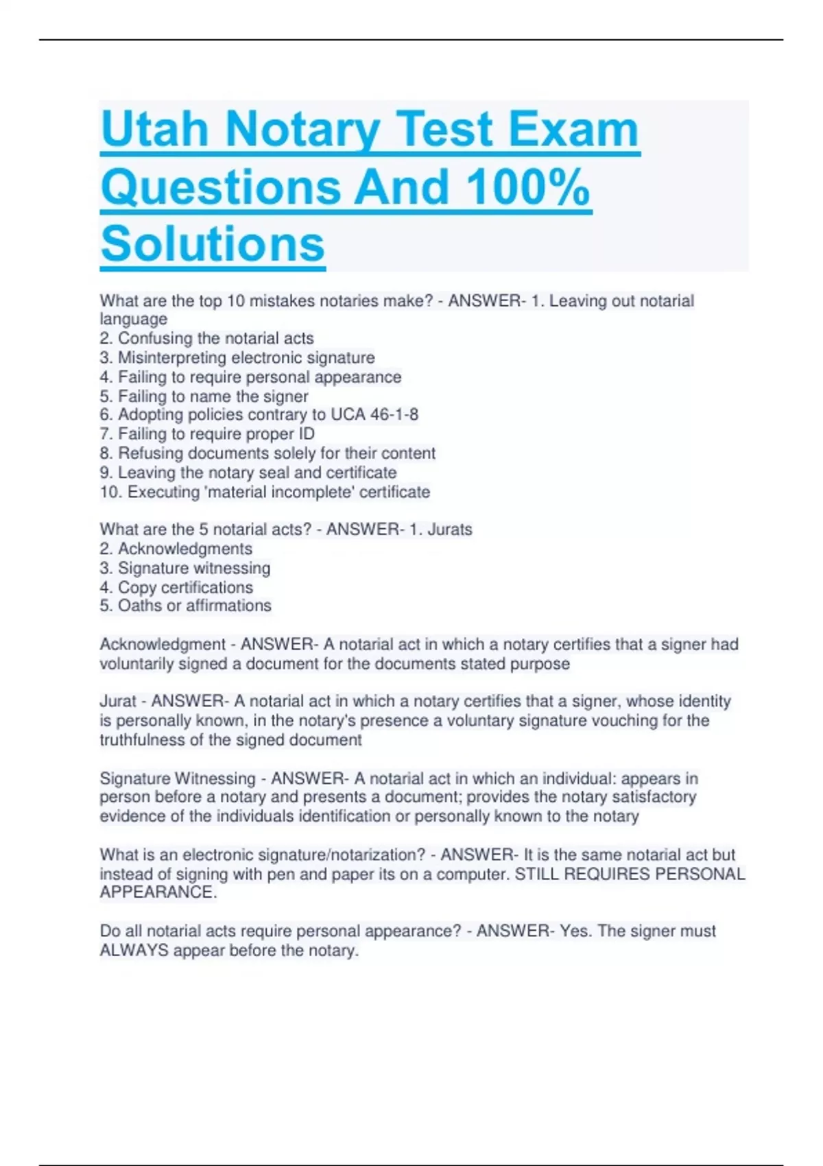 Utah Notary Test Exam Questions And 100% Solutions What are the top 10 mistakes notaries make? - ANSWER- 1. Leaving out notarial language 2. Confusing the notarial acts 3. Misinterpreting electronic signature 4. Failing to require personal appearance 5. Failing to name the signer 6. Adopting policies contrary to UCA 46-1-8 7. Failing to require proper ID 8. Refusing documents solely for their content 9. Leaving the notary seal and certificate 10. Executing 'material incomplete' certificate What are the 5 notarial acts? - ANSWER- 1. Jurats 2. Acknowledgments 3. Signature witnessing 4. Copy certifications 5. Oaths or affirmations Acknowledgment - ANSWER- A notarial act in which a notary certifies that a signer had voluntarily signed a document for the documents stated purpose Jurat - ANSWER- A notarial act in which a notary certifies that a signer, whose identity is personally known, in the notary's presence a voluntary signature vouching for the truthfulness of the signed document Signature Witnessing - ANSWER- A notarial act in which an individual: appears in person before a notary and presents a document; provides the notary satisfactory evidence of the individuals identification or personally known to the notary What is an electronic signature/notarization? - ANSWER- It is the same notarial act but instead of signing with pen and paper its on a computer. STILL REQUIRES PERSONAL APPEARANCE.