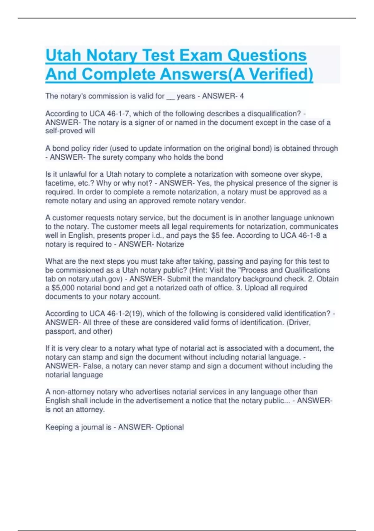 - Utah Notary Tes Questi And Complete Answe
