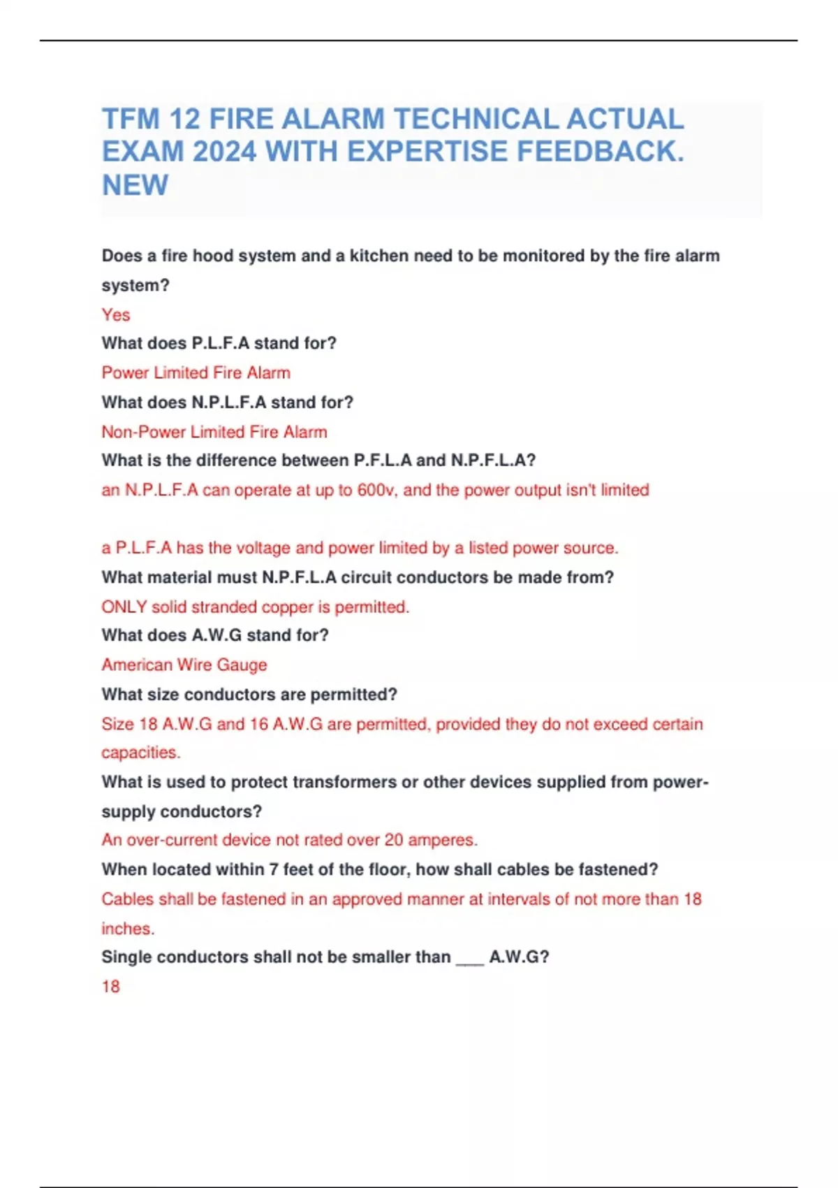 TFM 12 FIRE ALARM TECHNICAL ACTUAL EXAM 2024 WITH EXPERTISE FEEDBACK. NEW Does a fire hood system and a kitchen need to be monitored by the fire alarm system? Yes What does P.L.F.A stand for? Power Limited Fire Alarm What does N.P.L.F.A stand for? Non-Power Limited Fire Alarm What is the difference between P.F.L.A and N.P.F.L.A? an N.P.L.F.A can operate at up to 600v, and the power output isn't limited a P.L.F.A has the voltage and power limited by a listed power source. What material must N.P.F.L.A circuit conductors be made from? ONLY solid stranded copper is permitted. What does A.W.G stand for? American Wire Gauge What size conductors are permitted? Size 18 A.W.G and 16 A.W.G are permitted, provided they do not exceed certain capacities. What is used to protect transformers or other devices supplied from powersupply conductors? An over-current device not rated over 20 amperes. When located within 7 feet of the floor, how shall cables be fastened? Cables shall be fastened in an approved manner at intervals of not more than 18 inches. Single conductors shall not be smaller than ___ A.W.G? 18 Conductors of 28 A.W.G shall only be permitted in which circumstance? Spliced with a connector listed as suitable for 26 to 24 A.W.G How shall P.F.L.A conductors NOT be installed?