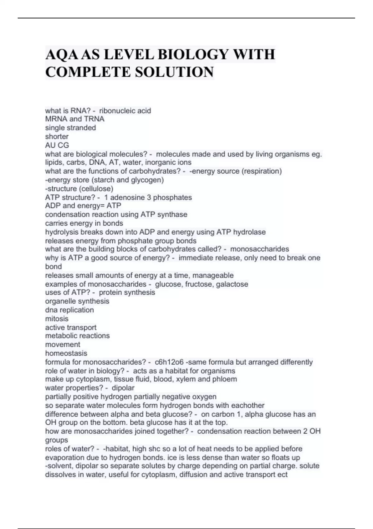 AQA AS LEVEL BIOLOGY WITH COMPLETE SOLUTION what is RNA? - ribonucleic acid MRNA and TRNA single stranded shorter AU CG what are biological molecules? - molecules made and used by living organisms eg. lipids, carbs, DNA, AT, water, inorganic ions what are the functions of carbohydrates? - -energy source (respiration) -energy store (starch and glycogen) -structure (cellulose) ATP structure? - 1 adenosine 3 phosphates ADP and energy= ATP condensation reaction using ATP synthase carries energy in bonds hydrolysis breaks down into ADP and energy using ATP hydrolase releases energy from phosphate group bonds what are the building blocks of carbohydrates called? - monosaccharides why is ATP a good source of energy? - immediate release, only need to break one bond releases small amounts of energy at a time, manageable examples of monosaccharides - glucose, fructose, galactose uses of ATP? - protein synthesis organelle synthesis dna replication mitosis active transport metabolic reactions movement homeostasis formula for monosaccharides? - c6h12o6 -same formula but arranged differently role of water in biology? - acts as a habitat for organisms make up cytoplasm, tissue fluid, blood, xylem and phloem water properties? - dipolar partially positive hydrogen partially negative oxygen so separate water molecules form hydrogen bonds with eachother difference between alpha and beta glucose? - on carbon 1, alpha glucose has an OH group on the bottom. beta glucose has it at the top. how are monosaccharides joined together? - condensation reaction between 2 OH groups roles of water? - -habitat, high shc so a lot of heat needs to be applied before evaporation due to hydrogen bonds. ice is less dense than water so floats up -solvent, dipolar so separate solutes by charge depending on partial charge. solute dissolves in water, useful for cytoplasm, diffusion and active transport ect -hydrostatic pressure, when pressurised, water provides a strong pushing force particularly in mass flow. supports turgidity -homeostasis, sweat on skin uses blood heat to evaporate, cooling individual. sweat is made up of hydrogen bonds,stable structure, large amount of heat to evaporate. LATENT HEAT OF EVAPORATION. bond in carbohydrate? - glycosidic what are inorganic ions? - salts or minerals don't contain carbon eg sodium and chloride ions examples of disaccharides - sucrose, lactose (glucose + galactose), maltose (glucose + glucose) kingdoms of biology? - animal, plant, bacteria, fungi, protocista animal and plant multicellular others are microorganisms viruses aren't living all organisms made up of cells eukaryotic vs prokaryotic - eukaryotic - membrane bound organelles eg. nucleus prokaryotic - no membrane bound organelles, smaller ribosomes formula for disaccharides? - c12h22o11 what are the 2 forms of reproduction? - sexual- 2 parents each provide gamete which fuse to make zygote which develops into organism