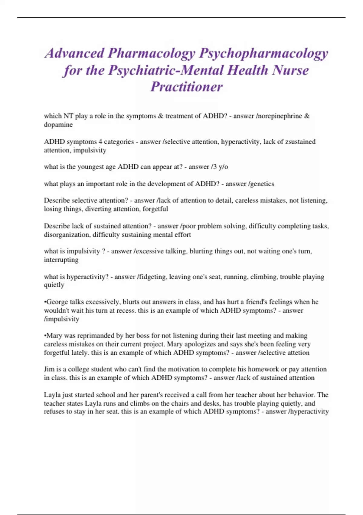 which NT play a role in the symptoms & treatment of ADHD? - answer /norepinephrine & dopamine ADHD symptoms 4 categories - answer /selective attention, hyperactivity, lack of zsustained attention, impulsivity what is the youngest age ADHD can appear at? - answer /3 y/o what plays an important role in the development of ADHD? - answer /genetics Describe selective attention? - answer /lack of attention to detail, careless mistakes, not listening, losing things, diverting attention, forgetful Describe lack of sustained attention? - answer /poor problem solving, difficulty completing tasks, disorganization, difficulty sustaining mental effort what is impulsivity ? - answer /excessive talking, blurting things out, not waiting one's turn, interrupting what is hyperactivity? - answer /fidgeting, leaving one's seat, running, climbing, trouble playing quietly •George talks excessively, blurts out answers in class, and has hurt a friend's feelings when he wouldn't wait his turn at recess. this is an example of which ADHD symptoms? - answer /impulsivity •Mary was reprimanded by her boss for not listening during their last meeting and making careless mistakes on their current project. Mary apologizes and says she's been feeling very forgetful lately. this is an example of which ADHD symptoms? - answer /selective attetion Jim is a college student who can't find the motivation to complete his homework or pay attention in class. this is an example of which ADHD symptoms? - answer /lack of sustained attention Layla just started school and her parent's received a call from her teacher about her behavior. The teacher states Layla runs and climbs on the chairs and desks, has trouble playing quietly, and refuses to stay in her seat. this is an example of which ADHD symptoms? - answer /hyperactivity