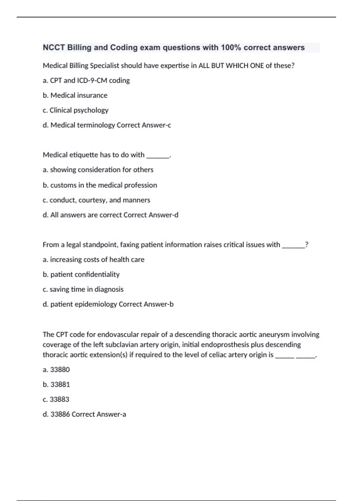 NCCT Billing and Coding exam questions with 100% correct answers Medical Billing Specialist should have expertise in ALL BUT WHICH ONE of these? a. CPT and ICD-9-CM coding b. Medical insurance c. Clinical psychology d. Medical terminology Correct Answer-c Medical etiquette has to do with ______. a. showing consideration for others b. customs in the medical profession c. conduct, courtesy, and manners d. All answers are correct Correct Answer-d From a legal standpoint, faxing patient information raises critical issues with ______? a. increasing costs of health care b. patient confidentiality c. saving time in diagnosis d. patient epidemiology Correct Answer-b The CPT code for endovascular repair of a descending thoracic aortic aneurysm involving coverage of the left subclavian artery origin, initial endoprosthesis plus descending thoracic aortic extension(s) if required to the level of celiac artery origin is _____ _____. a. 33880 b. 33881 c. 33883 d. 33886 Correct Answer-a ALL BUT WHICH ONE of the following is important patient information for office records? a. Insurance policy numbers b. Date of birth c. Social Security number d. Religious preference Correct Answer-d The code for chronic tonsillitis is _____. a. 463.00 b. 474.00 c. 474.02 d. 476.00 Correct Answer-b Fo