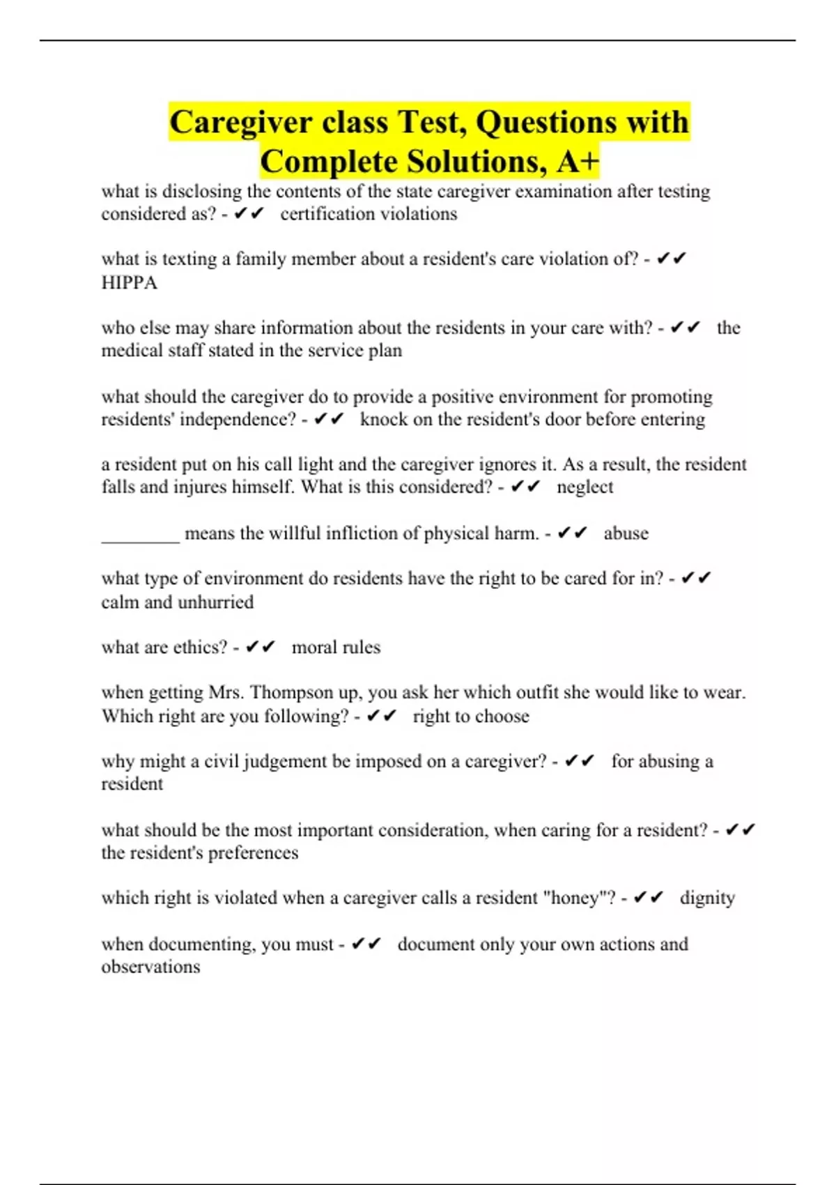 Caregiver class Test, Questions with Complete Solutions, A+