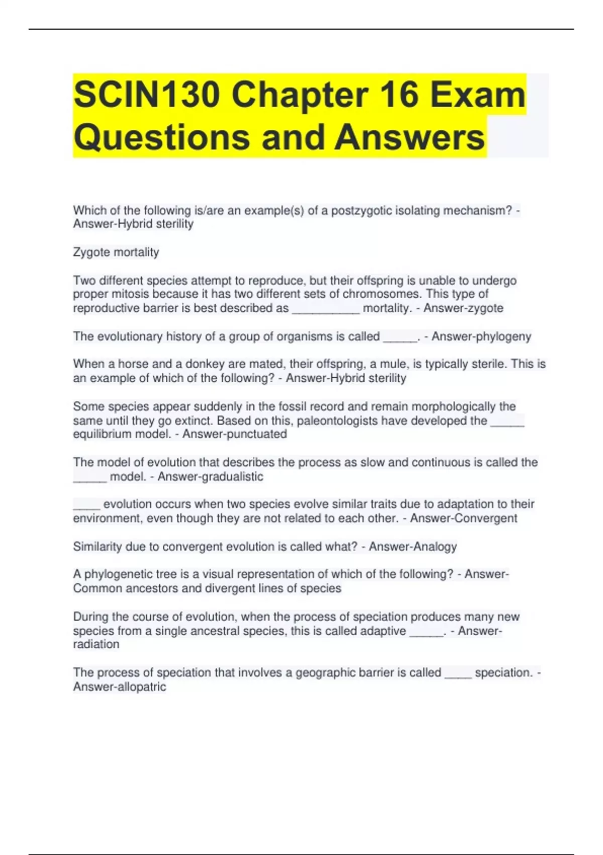 SCIN130 Chapter 16 Exam Questions and Answers Which of the following is/are an example(s) of a postzygotic isolating mechanism? - Answer-Hybrid sterility Zygote mortality Two different species attempt to reproduce, but their offspring is unable to undergo proper mitosis because it has two different sets of chromosomes. This type of reproductive barrier is best described as __________ mortality. - Answer-zygote The evolutionary history of a group of organisms is called _____. - Answer-phylogeny When a horse and a donkey are mated, their offspring, a mule, is typically sterile. This is an example of which of the following? - Answer-Hybrid sterility Some species appear suddenly in the fossil record and remain morphologically the same until they go extinct. Based on this, paleontologists have developed the _____ equilibrium model. - Answer-punctuated The model of evolution that describes the process as slow and continuous is called the _____ model. - Answer-gradualistic ____ evolution occurs when two species evolve similar traits due to adaptation to their environment, even though they are not related to each other. - Answer-Convergent Similarity due to convergent evolution is called what? - Answer-Analogy