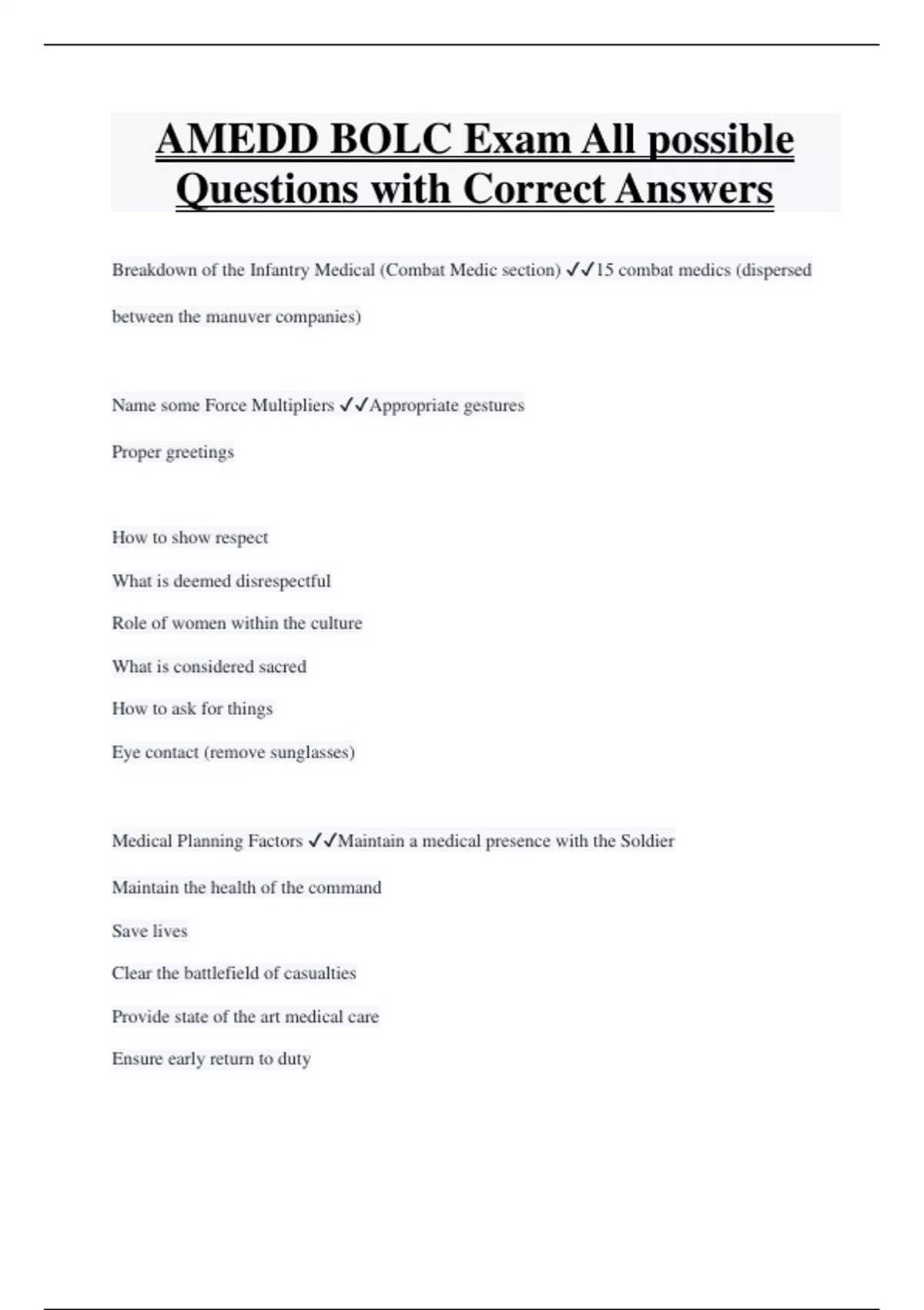 AMEDD BOLC Exam All possible Questions with Correct Answers Breakdown of the Infantry Medical (Combat Medic section) 15 combat medics (dispersed between the manuver companies) Name some Force Multipliers Appropriate gestures Proper greetings How to show respect What is deemed disrespectful Role of women within the culture What is considered sacred How to ask for things Eye contact (remove sunglasses) Medical Planning Factors Maintain a medical presence with the Soldier Maintain the health of the command Save lives Clear the battlefield of casualties Provide state of the art medical care