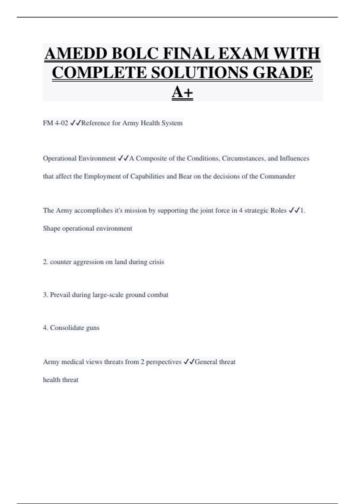 AMEDD BOLC FINAL EXAM WITH COMPLETE SOLUTIONS GRADE A+ FM 4-02 Reference for Army Health System Operational Environment A Composite of the Conditions, Circumstances, and Influences that affect the Employment of Capabilities and Bear on the decisions of the Commander The Army accomplishes it's mission by supporting the joint force in 4 strategic Roles 1. Shape operational environment 2. counter aggression on land during crisis 3. Prevail during large-scale ground combat 4. Consolidate guns Army medical views threats from 2 perspectives General threat health threat