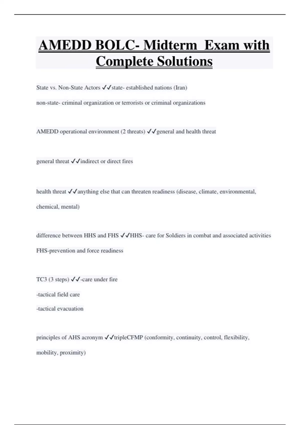AMEDD BOLC- Midterm Exam with Complete Solutions State vs. Non-State Actors state- established nations (Iran) non-state- criminal organization or terrorists or criminal organizations AMEDD operational environment (2 threats) general and health threat general threat indirect or direct fires health threat anything else that can threaten readiness (disease, climate, environmental, chemical, mental) difference between HHS and FHS HHS- care for Soldiers in combat and associated activities FHS-prevention and force readiness TC3 (3 steps) -care under fire -tactical field care -tactical evacuation