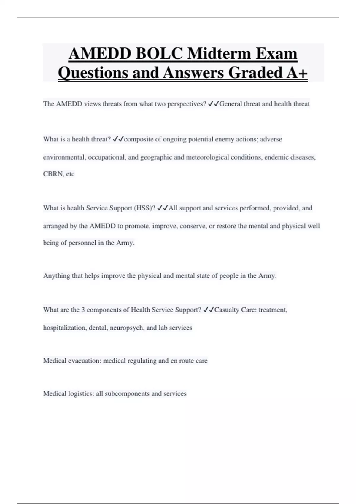 AMEDD BOLC Midterm Exam Questions and Answers Graded A+ The AMEDD views threats from what two perspectives? General threat and health threat What is a health threat? composite of ongoing potential enemy actions; adverse environmental, occupational, and geographic and meteorological conditions, endemic diseases, CBRN, etc What is health Service Support (HSS)? All support and services performed, provided, and arranged by the AMEDD to promote, improve, conserve, or restore the mental and physical well being of personnel in the Army. Anything that helps improve the physical and mental state of people in the Army