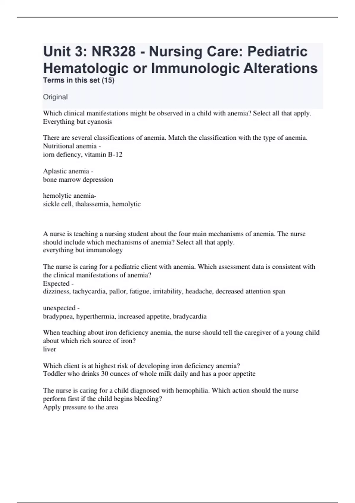 Unit 3: NR328 - Nursing Care: Pediatric Hematologic or Immunologic Alterations Terms in this set (15) Original Which clinical manifestations might be observed in a child with anemia? Select all that apply. Everything but cyanosis There are several classifications of anemia. Match the classification with the type of anemia. Nutritional anemia - iorn defiency, vitamin B-12 Aplastic anemia - bone marrow depression hemolytic anemia- sickle cell, thalassemia, hemolytic Brainpower Read More A nurse is teaching a nursing student about the four main mechanisms of anemia. The nurse should include which mechanisms of anemia? Select all that apply. everything but immunology The nurse is caring for a pediatric client with anemia. Which assessment data is consistent with the clinical manifestations of anemia? Expected - dizziness, tachycardia, pallor, fatigue, irritability, headache, decreased attention span unexpected - bradypnea, hyperthermia, increased appetite, bradycardia When teaching about iron deficiency anemia, the nurse should tell the caregiver of a young child about which rich source of iron? liver Which client is at highest risk of developing iron deficiency anemia? Toddler who drinks 30 ounces of whole milk daily and has a poor appetite The nurse is caring for a child diagnosed with hemophilia. Which action should the nurse perform first if the child begins bleeding? Apply pressure to the area