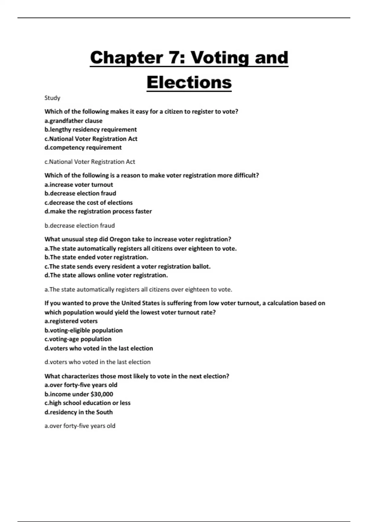 Chapter 7 Voting and Election Which of the following makes it easy for a citizen to register to vote? father clause hy residency requirement c.National Voter Registration Act tency requirement c.National Voter Registration Act Which of the following is a reason to make voter registration more difficult? ase voter turnout ase election fraud ase the cost of elections the registration process faster ase election fraud What unusual step did Oregon take to increase voter registration? a.The state automatically registers all citizens over eighteen to vote. b.The state ended voter registration. c.The state sends every resident a voter registration ballot. d.The state allows online voter registration. a.The state automatically registers all citizens over eighteen to vote. If you wanted to prove the United States is suffering from low voter turnout, a calculation based on which population would yield the lowest voter turnout rate? tered voters g-eligible population g-age population s who voted in the last election s who voted in the last election What characterizes those most likely to vote in the next election? forty-five years old e under $30,000 school education or less ency in the South forty-five years old