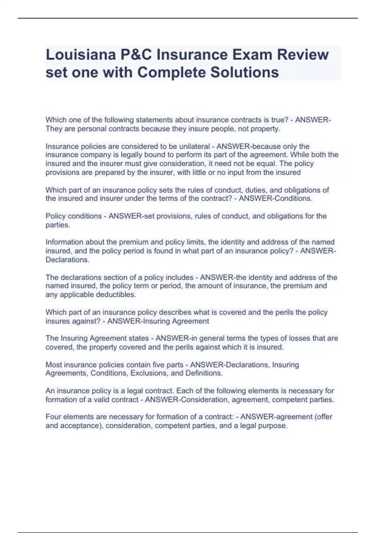 Louisiana P&C Insurance Exam Review set one with Complete Solutions Louisiana P&C Insurance Exam Review set one with Complete Solutions Louisiana P&C Insurance Exam Review set one with Complete Solutions Louisiana P&C Insurance Exam Review set one with Complete Solutions Which one of the following statements about insurance contracts is true? - ANSWER-They are personal contracts because they insure people, not property. Insurance policies are considered to be unilateral - ANSWER-because only the insurance company is legally bound to perform its part of the agreement. While both the insured and the insurer must give consideration, it need not be equal. The policy provisions are prepared by the insurer, with little or no input from the insured Which part of an insurance policy sets the rules of conduct, duties, and obligations of the insured and insurer under the terms of the contract? - ANSWER-Conditions. Policy conditions - ANSWER-set provisions, rules of conduct, and obligations for the parties.