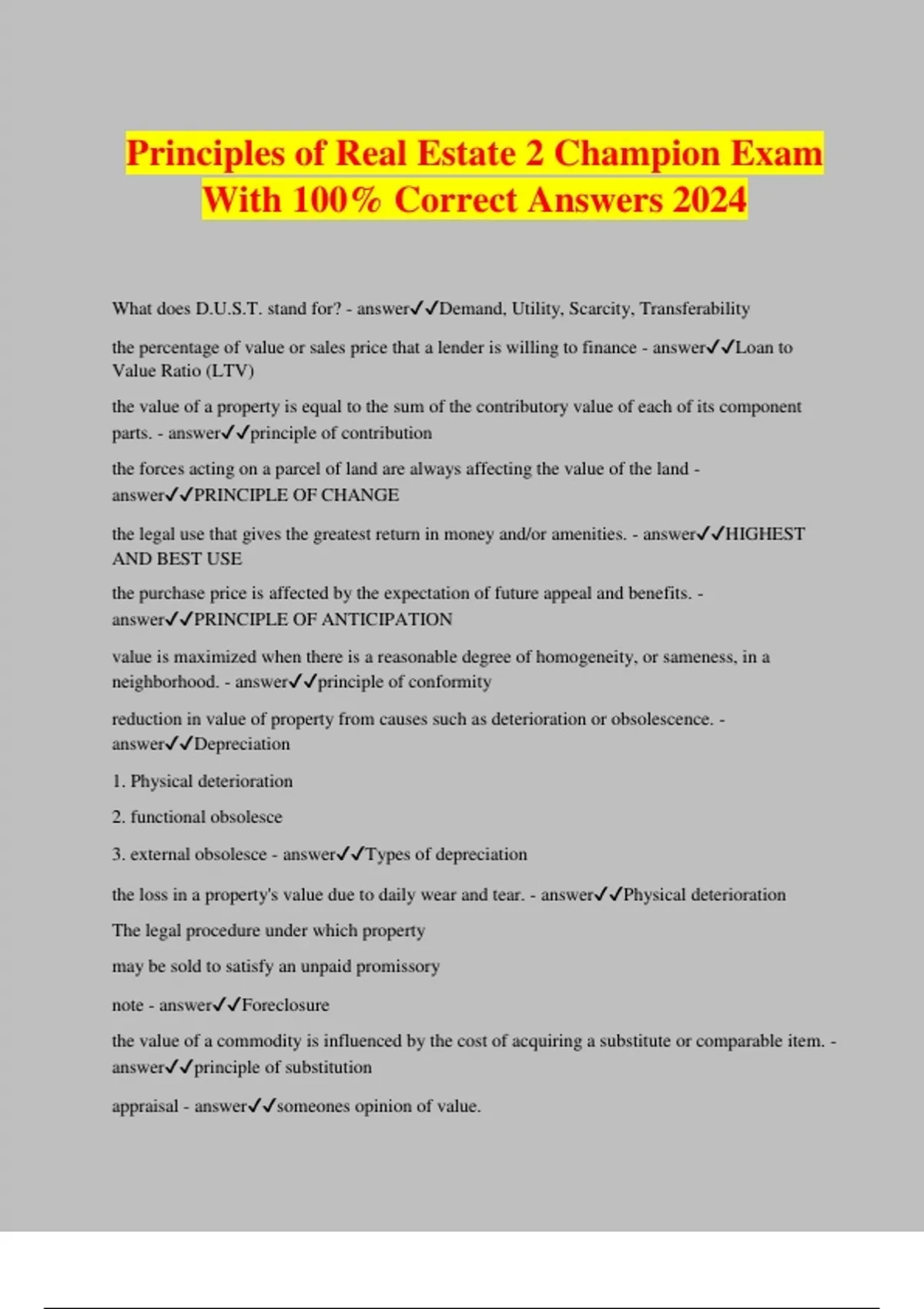 Principles of Real Estate 2 Champion Exam With 100% Correct Answers 2024 What does D.U.S.T. stand for? - answerDemand, Utility, Scarcity, Transferability the percentage of value or sales price that a lender is willing to finance - answerLoan to Value Ratio (LTV) the value of a property is equal to the sum of the contributory value of each of its component parts. - answerprinciple of contribution the forces acting on a parcel of land are always affecting the value of the land - answerPRINCIPLE OF CHANGE the legal use that gives the greatest return in money and/or amenities. - answerHIGHEST AND BEST USE the purchase price is affected by the expectation of future appeal and benefits. - answerPRINCIPLE OF ANTICIPATION value is maximized when there is a reasonable degree of homogeneity, or sameness, in a neighborhood. - answerprinciple of conformity reduction in value of property from causes such as deterioration or obsolescence. - answerDepreciation 1. Physical deterioration 2. functional obsolesce 3. external obsolesce - answerTypes of depreciation the loss in a property's value due to daily wear and tear. - answerPhysical deterioration The legal procedure under which property may be sold to satisfy an unpaid promissory note - answerForeclosure the value of a commodity is influenced by the cost of acquiring a substitute or comparable item. - answerprinciple of substitution appraisal - answersomeones opinion of value. The actual age of the property in years. - answerChronological Age The appraiser's estimate of the age of the house based upon its ongoing maintenance and upgrades. - answerEffective Age TYPES OF APPRAISAL REVIEWS - answer1. Desk Review 2. Field Review to improve property when the value added by the improvement exceeds cost of the improvement. - answerPRINCIPLE OF INCREASING AND DECREASING RETURNS demand for real estate is great and the supply is short, prices in the marketplace go up. - answerPRINCIPLE OF SUPPLY AND DEMAND The presence of lower-priced properties in the area will cause a decline in the value of the subject property - answerPRINCIPLE OF REGRESSION The absence of competition will cause prices to increase in the marketplace - answerPRINCIPLE OF COMPETITION Acronym for Characteristics of Value - answerD.U.S.T. The price a willing seller will sell for and the price a willing buyer will pay. - answerMarket value Most common misunderstood appraisal concept? - answerMarket Value Does price equal value? - answerNo, many factors go into determining the market value of a property. Ad valorem - answeraccording to value What are taxes based on? - answerAssessed Value Appraiser must follow what? - answerUniform Standards of Professional Appraisal Practice (USPAP). URAR is commonly referred as - answer1004 Uniform Residential Appraisal Report (URAR) is known as - answerFannie Mae 1004 or Freddie Mac form 70 Standards that have been established by the Appraisal Standards Board of the Appraisal Foundation - answerUSPAP Value - answerDoes not always equal price If a type of property in a market area is too abundant, it has reduced value - answerScarcity Many lenders, especially when dealing with high-LTV loans, will order this type of appraisal - answerField Review 3 approaches to value are - answer1. Sales Comparison Approach 2. Cost Approach 3. Income Approach appraiser focuses on recent sales in determining the value of the subject - answerSALES COMPARISON APPROACH How many comparison sales will and appraiser gather? - answerMinimum of 3. some lenders require 4 The degree to which a comparable is adjusted in 2 ways - answer1. Net adjustment 2. gross adjustment the absolute adjustments made to the comparable, considering those that are positive and negative - answerNet Adjustments - the sum of all adjustments, whether or not they are positive or negative - answerGross Adjustments the market value of the property considers how much a new structure of this size and type would currently cost to build. - answerCOST APPROACH loss in desirability of the style, layout, or function of an element of a property over time. - answerFunctional obsolescence to the loss in value of a property caused by factors outside of the property itself - answerExternal obsolescence Process of estimating the value of an income-producing property by capitalization of the annual net income. - answerINCOME APPROACH Gross Rent Multiplier formula - answerGRM = Sales Price ÷ Monthly Rent Value = Income ÷ Return - answerIncome Capitalization Formula What is the final step in the appraisal process? - answerReconciliation What is the percentage of value or sales price that a lender is willing to finance? - answerloan-to-value ratio (LTV) How many hours of education required for Appraiser Trainee? - answer75 hours How many appraiser trainee's can one person sponsor at one time? - answerNo more than